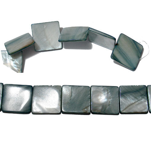 30mm Grey Shell Beads are glossy shell beads that are large flat square-shaped beads. The beads are approximately 30mm long by 30mm wide (square) and 4mm thick. These are natural shell and no two beads are alike. Thread holes are drilled through the center of the bead.