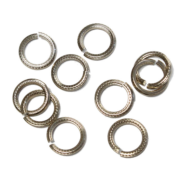 10mm Rope Jump Rings are large diameter with a rope-like pattern impressed on the side of the rings. This makes the wire slightly compressed side to side (not quite perfectly round) as well as having a half hard temper. These rings are made with 1.85mm thick wire (13 Gauge AWG) with an aspect ratio of 5.3. The aspect ratio should be considered approximate since the wire is not perfectly round. The outside diameter (OD) is 13.9mm.