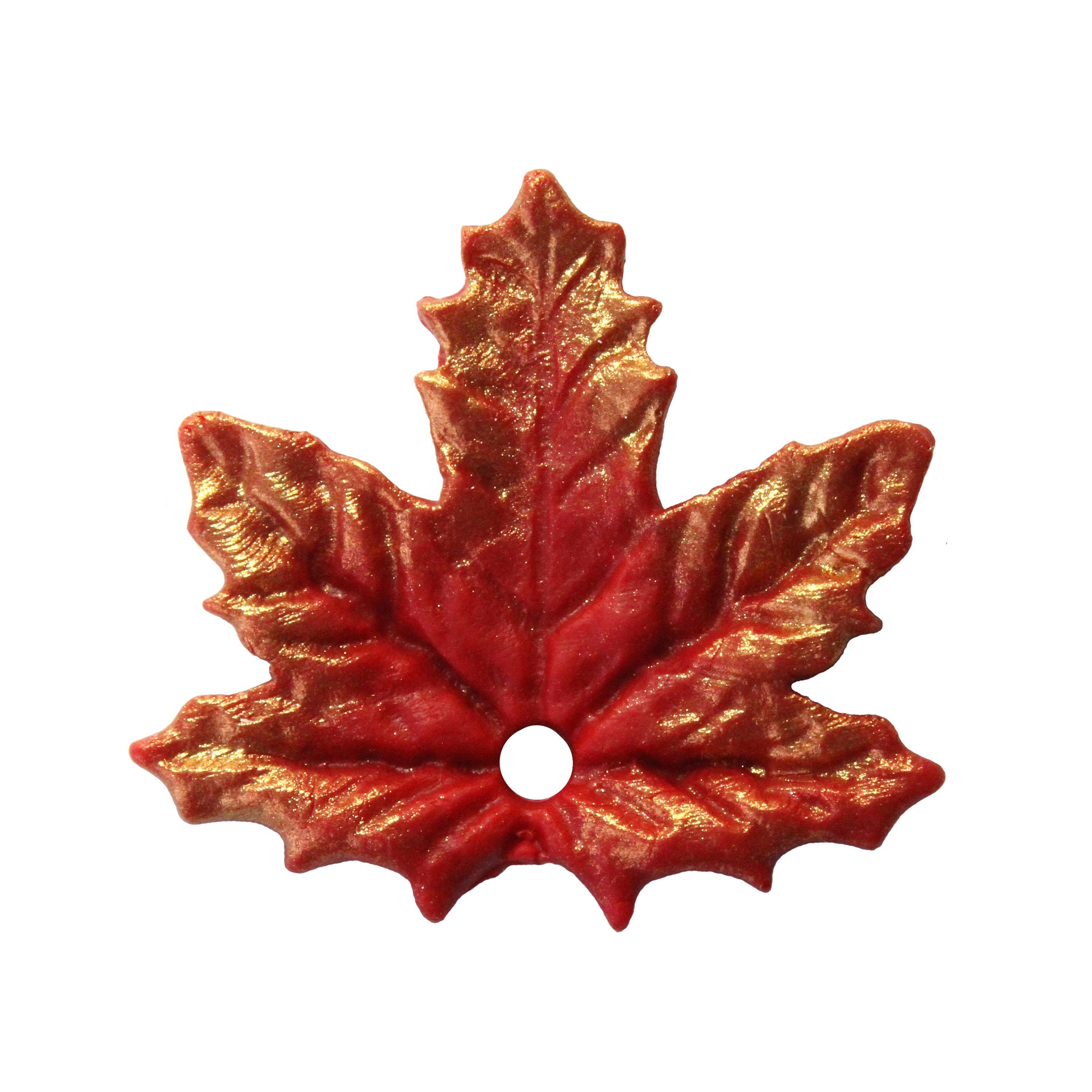 Large Maple Leaf Charm is a lightweight polymer clay charm that has a golden frosting at the leaf tips. This charm is shaped similar to the leaf from a Red Maple tree. This is a one sided charm with the front finely detailed and the reverse is plain.