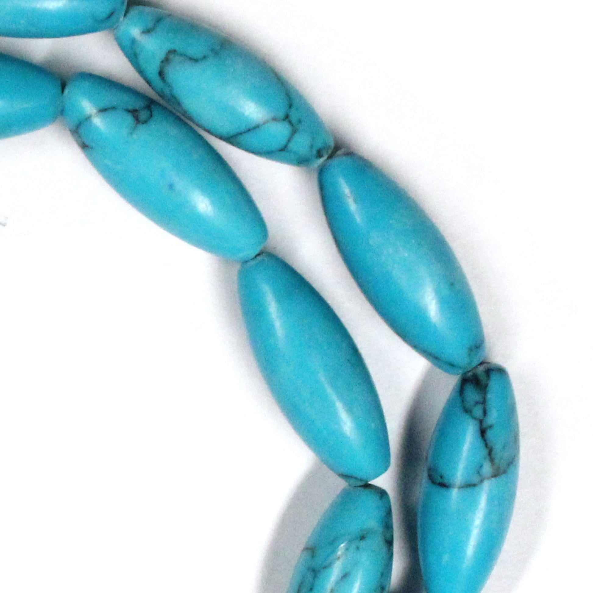 Turquoise Rice Beads are man-made beads made of reconstructed stone turquoise. Beautiful blue with a simulated matrix these beads would be a magnificent addition on your next turquoise based earring or bracelet project. These beads are 16mm long and 6mm diameter and are thickest at the center tapering gently to the ends. Beads are drilled through the center along the long axis of the bead.