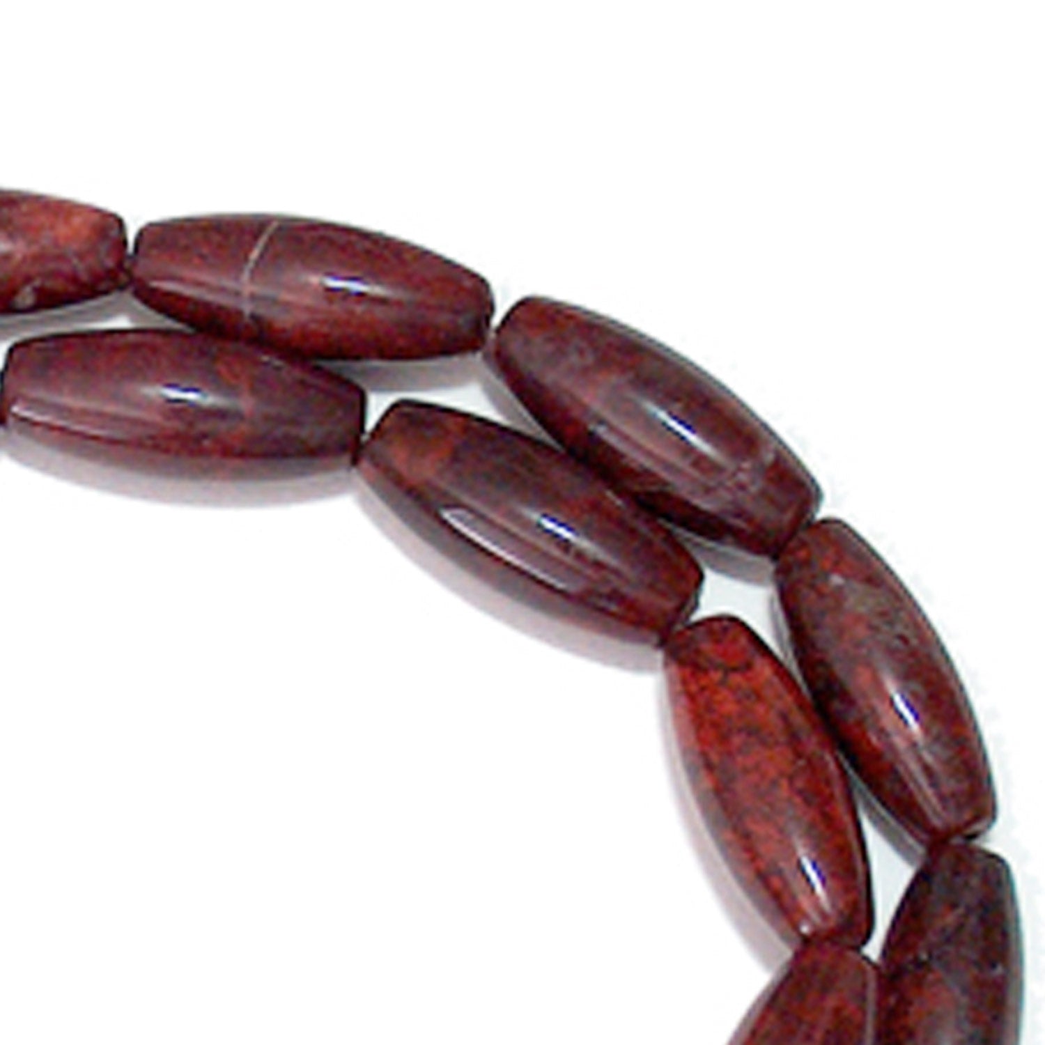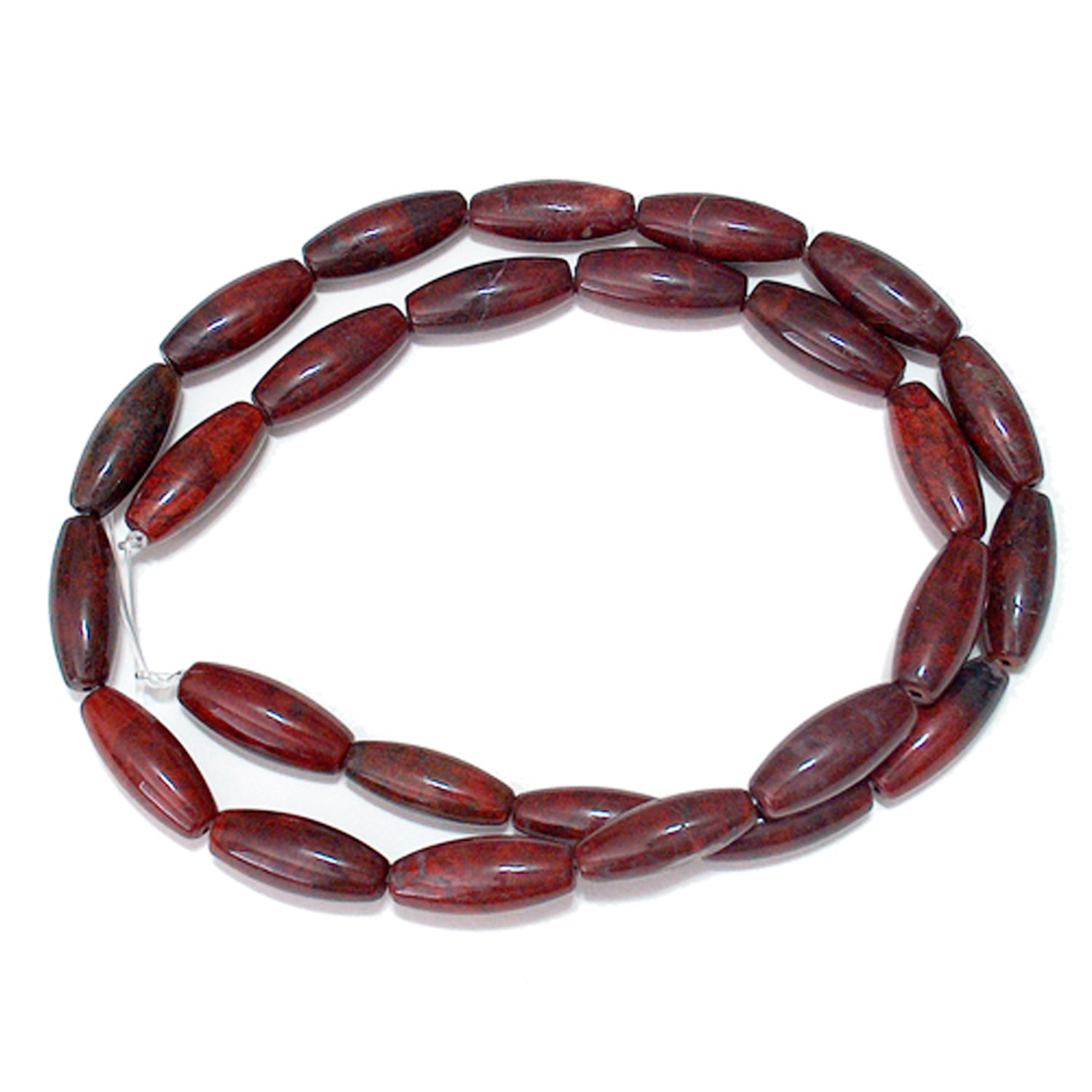 Poppy Jasper Rice Beads are 16mm long and 6mm diameter and are thickest at the center tapering gently to the ends. This jasper is a brownish colored bead with a mottled mix of blacks and greys. The browns are red toned earthy colors such as burnt umber or chocolate browns. Jasper very popular in jewelry because of its coloring and durability. Beads are drilled through the center along the long axis of the bead. These beads are smooth beads with a polished silky luster.