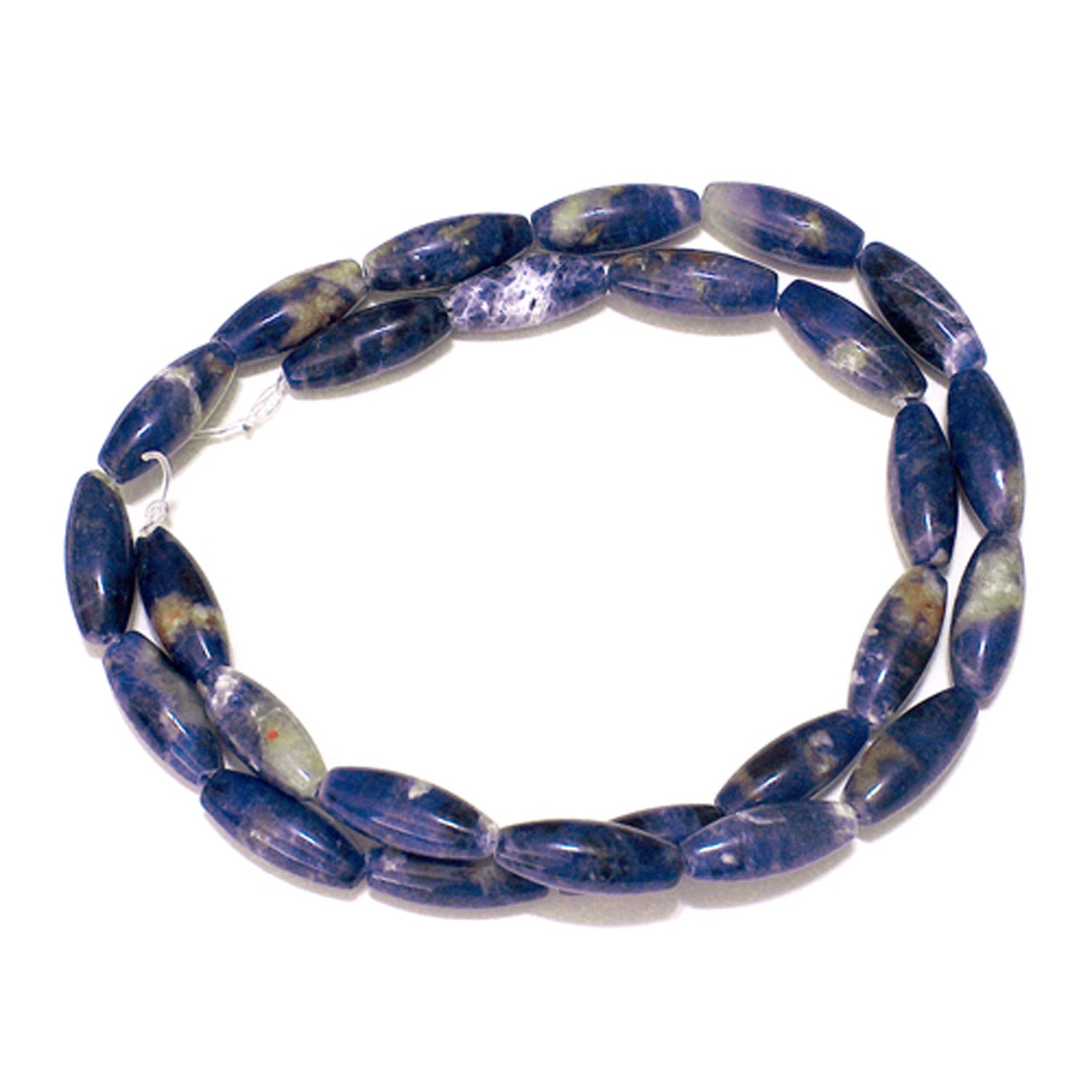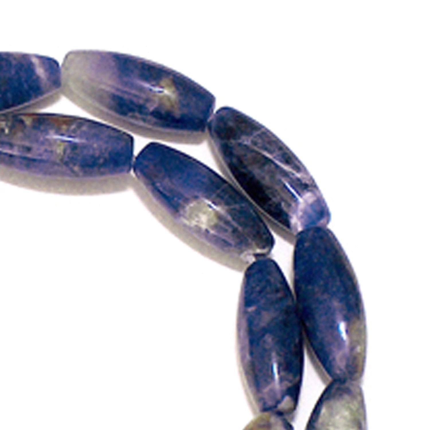 Sodalite Rice Beads are 16mm long and 6mm diameter and are thickest at the center tapering gently to the ends. Beads are drilled through the center along the long axis of the bead. Sodalite is primarily a deep navy / royal blue stone with white patches. Sodalite is a component of Lapis and can be difficult to distinguish one from the other. These beads are smooth beads with a polished silky luster.
