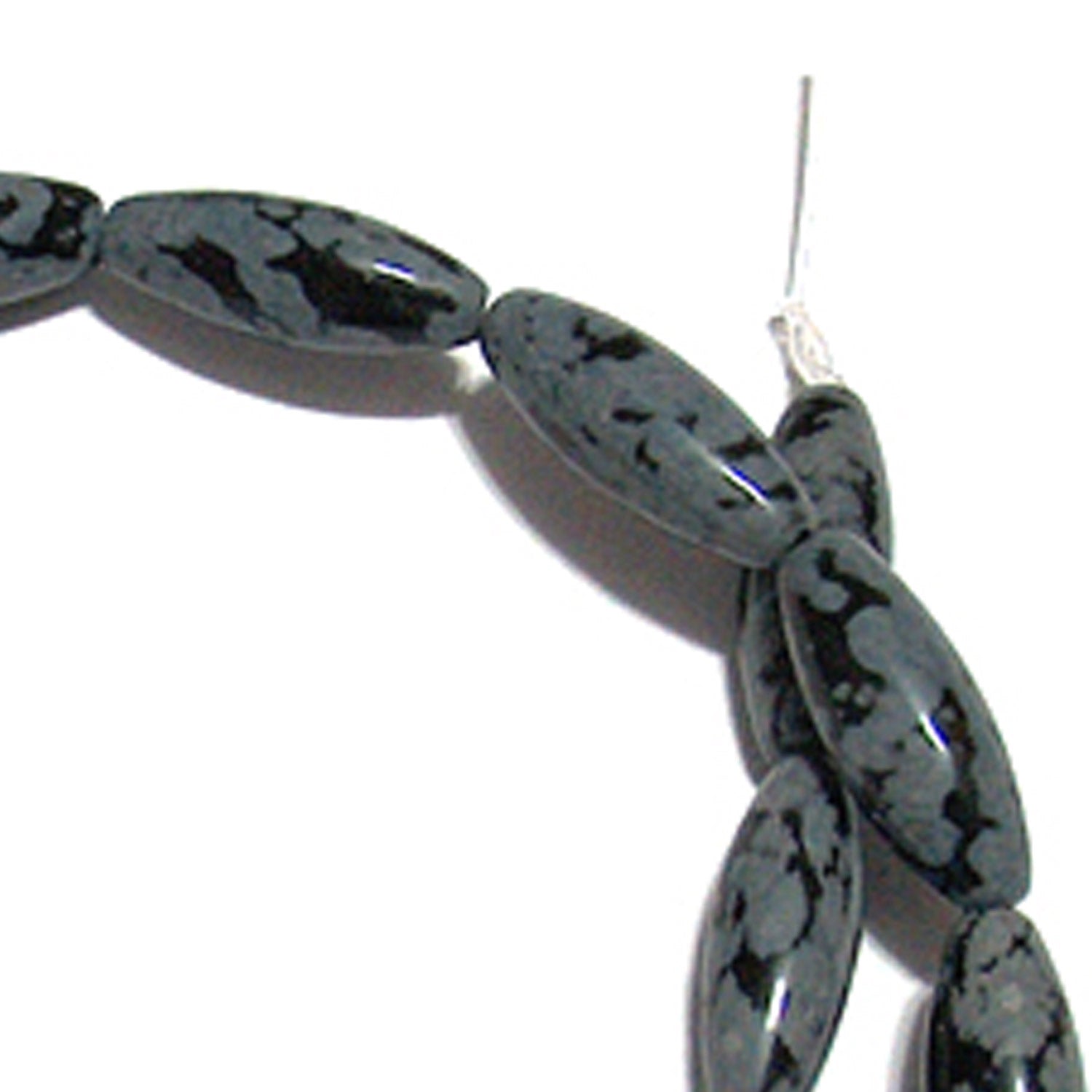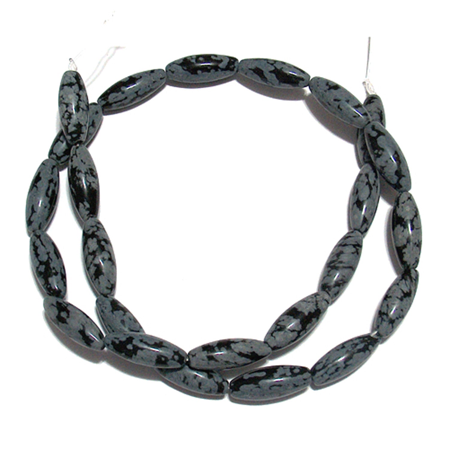 Snowflake Obsidian Rice Beads are 16mm long and 6mm diameter and are thickest at the center tapering gently to the ends. These beads have grey and black crystallized patches giving it its unique look and name. Beads are drilled through the center along the long axis of the bead. These beads are smooth beads with a polished silky luster.