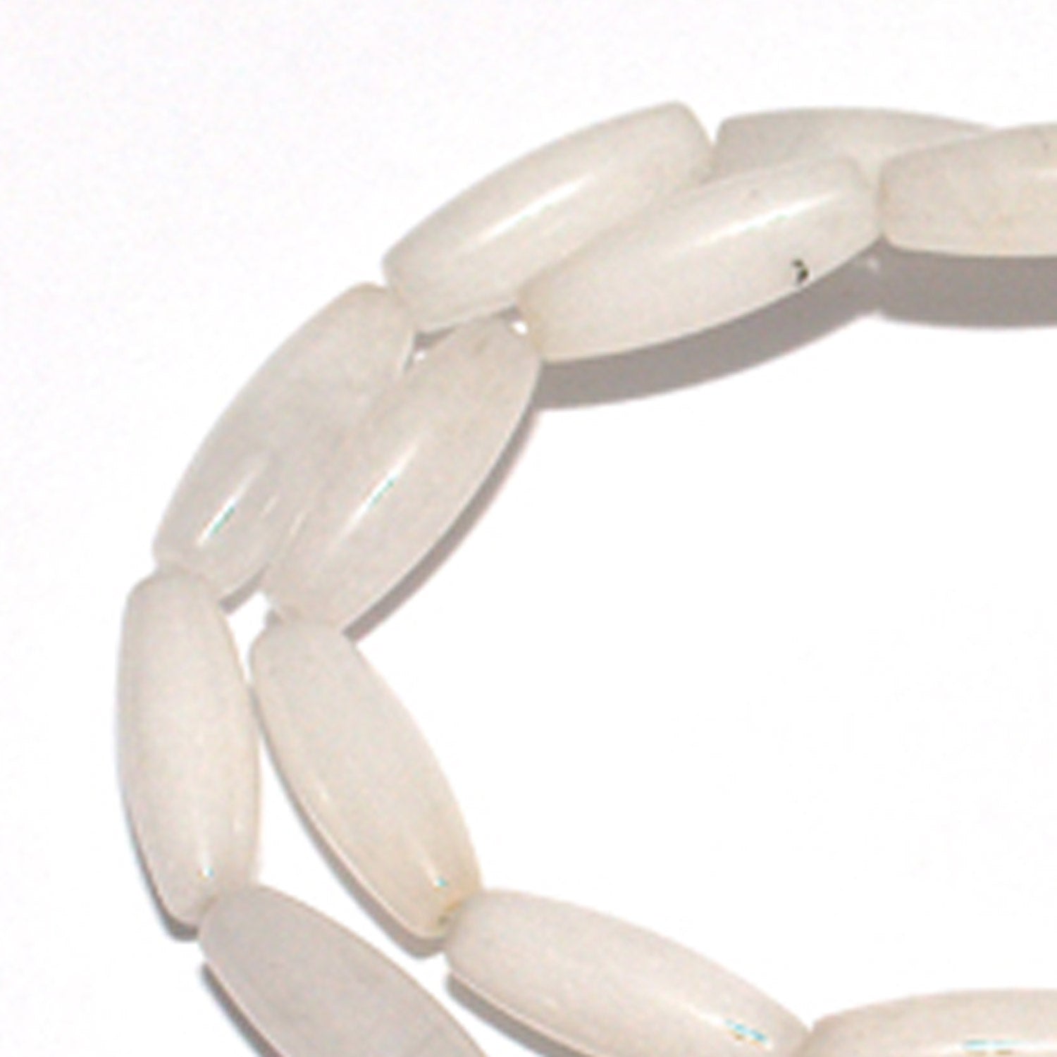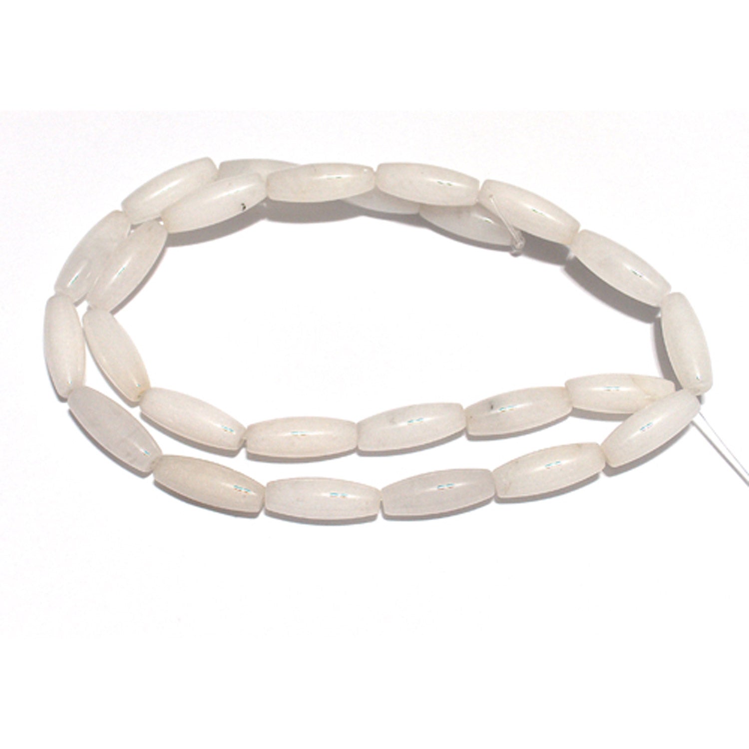 Snow Jade Rice Beads are a type of quartz that has a beautiful milky white / cream color semi-translucent appearance. These beads are 16mm long and 6mm diameter and are thickest at the center tapering gently to the ends. Beads are drilled through the center along the long axis of the bead. These beads are smooth beads with a polished silky luster.
