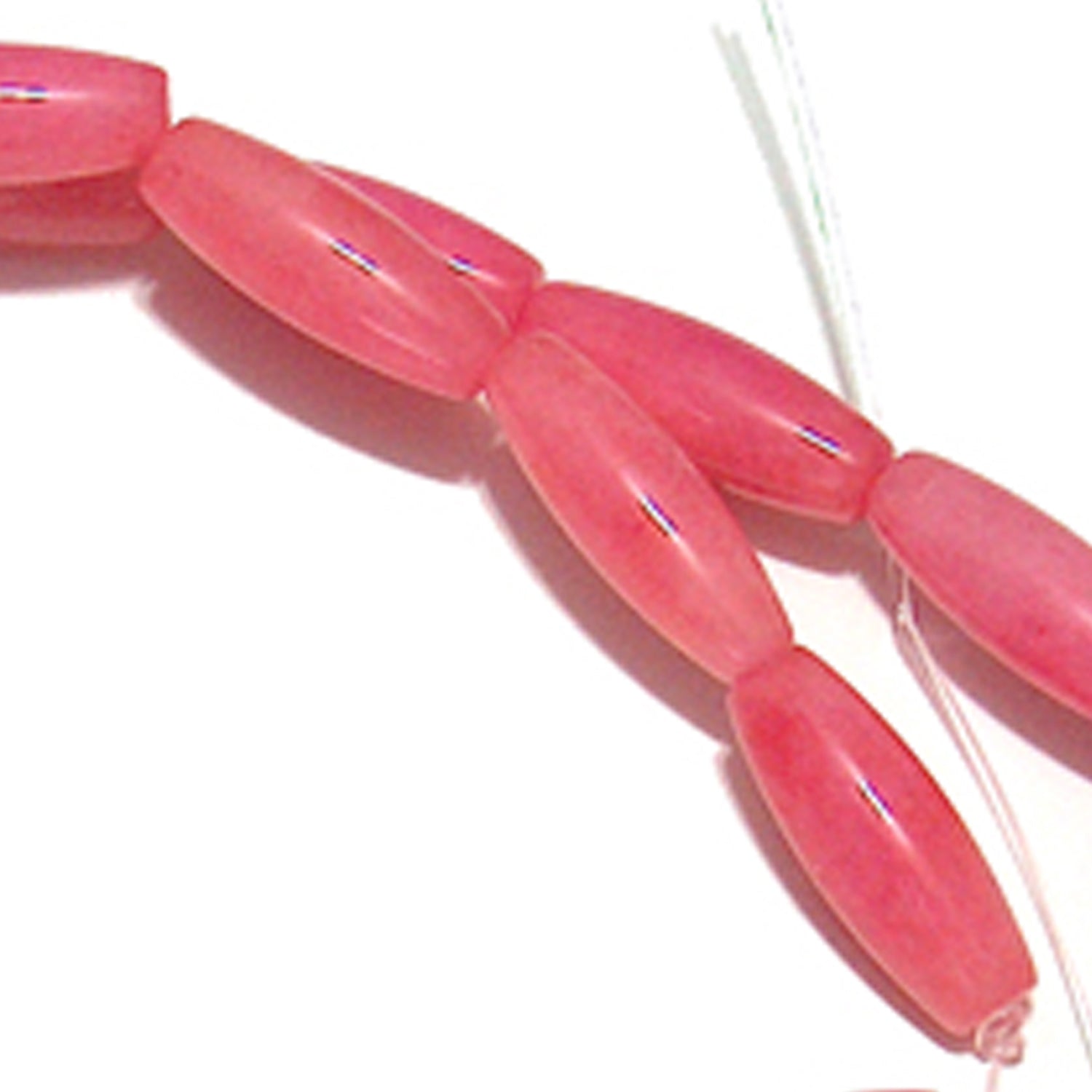 Fuchsia Candy Jade Rice Beads are 16mm long and 6mm diameter and are thickest at the center tapering gently to the ends. Beads are drilled through the center along the long axis of the bead. Candy Jade is simply hard rock that is permanently dyed for jewelry use. "Candy" colors (almost looks like bubblegum but don't eat them) are used to generate beautiful jewelry for those with an extreme color fetish. These beads are smooth beads with a polished silky luster.