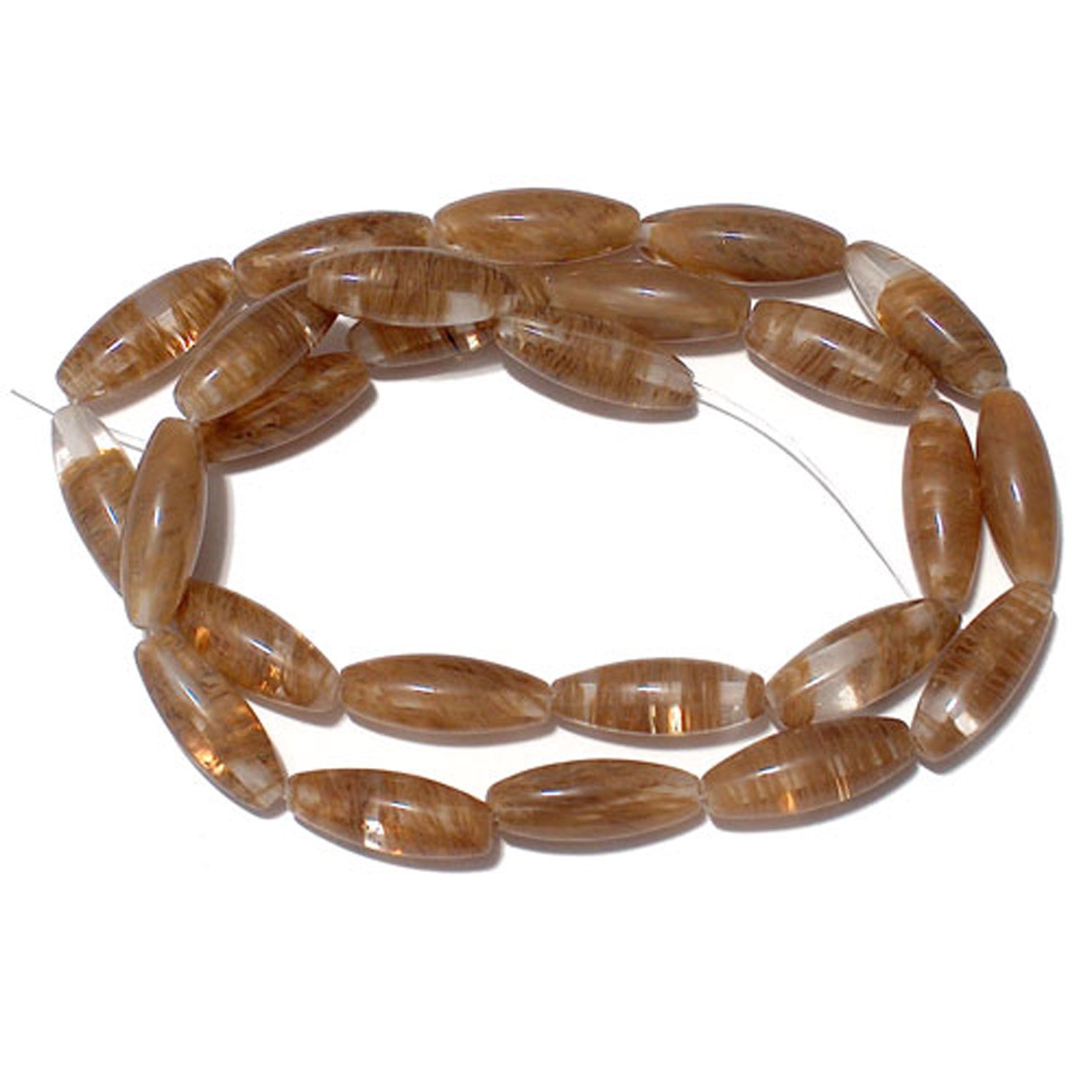 Rutile Quartz Rice Beads are man-made transparent beads with an infused brown sugar striping/ coloring. These beads are 16mm long and 6mm diameter and are thickest at the center tapering gently to the ends. Beads are drilled through the center along the long axis of the bead. These beads are smooth beads with a polished silky luster.