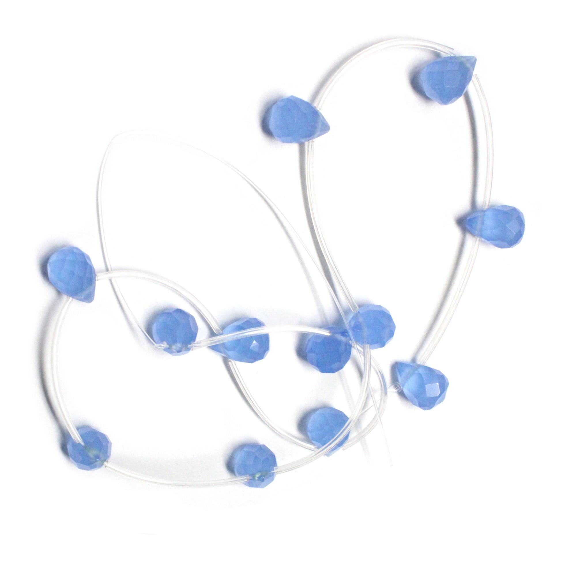 Blue Chalcedony Faceted Teardrop are faceted stone beads with a teardrop or briolette shape. These beads are man-made and as such are smooth and uniform in color. Each bead is 12mm long and 10mm diameter (base) and weighs 1.1 grams. Thread holes are side drilled near the top of the bead.