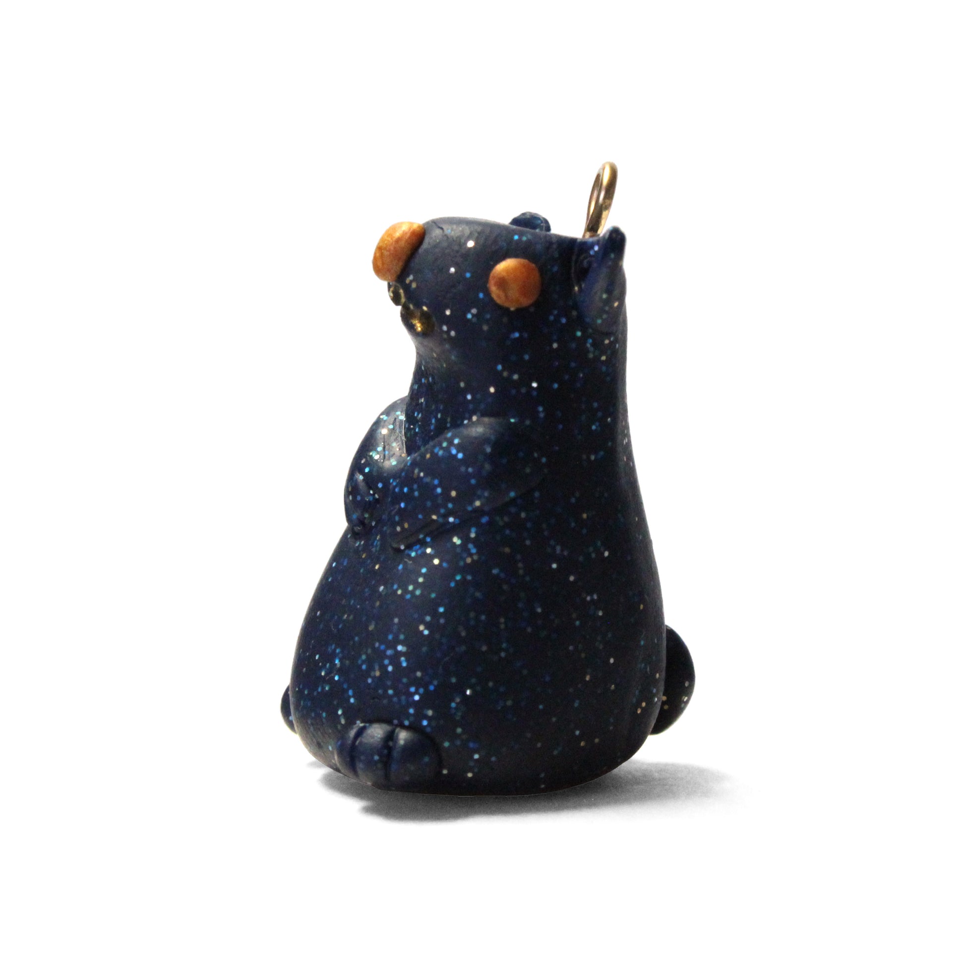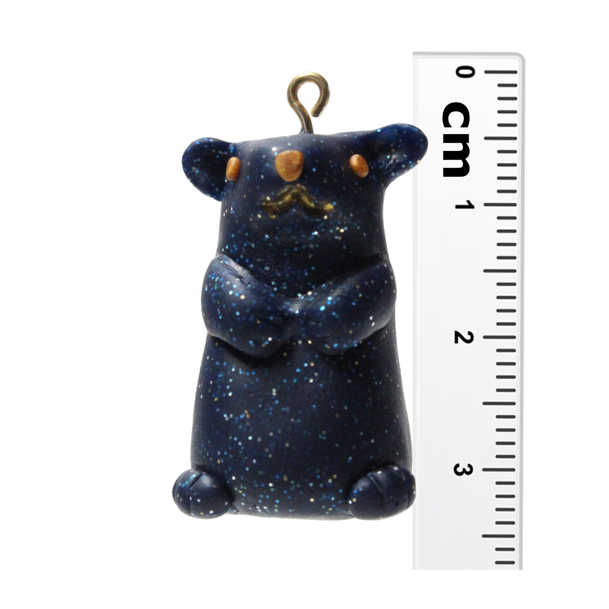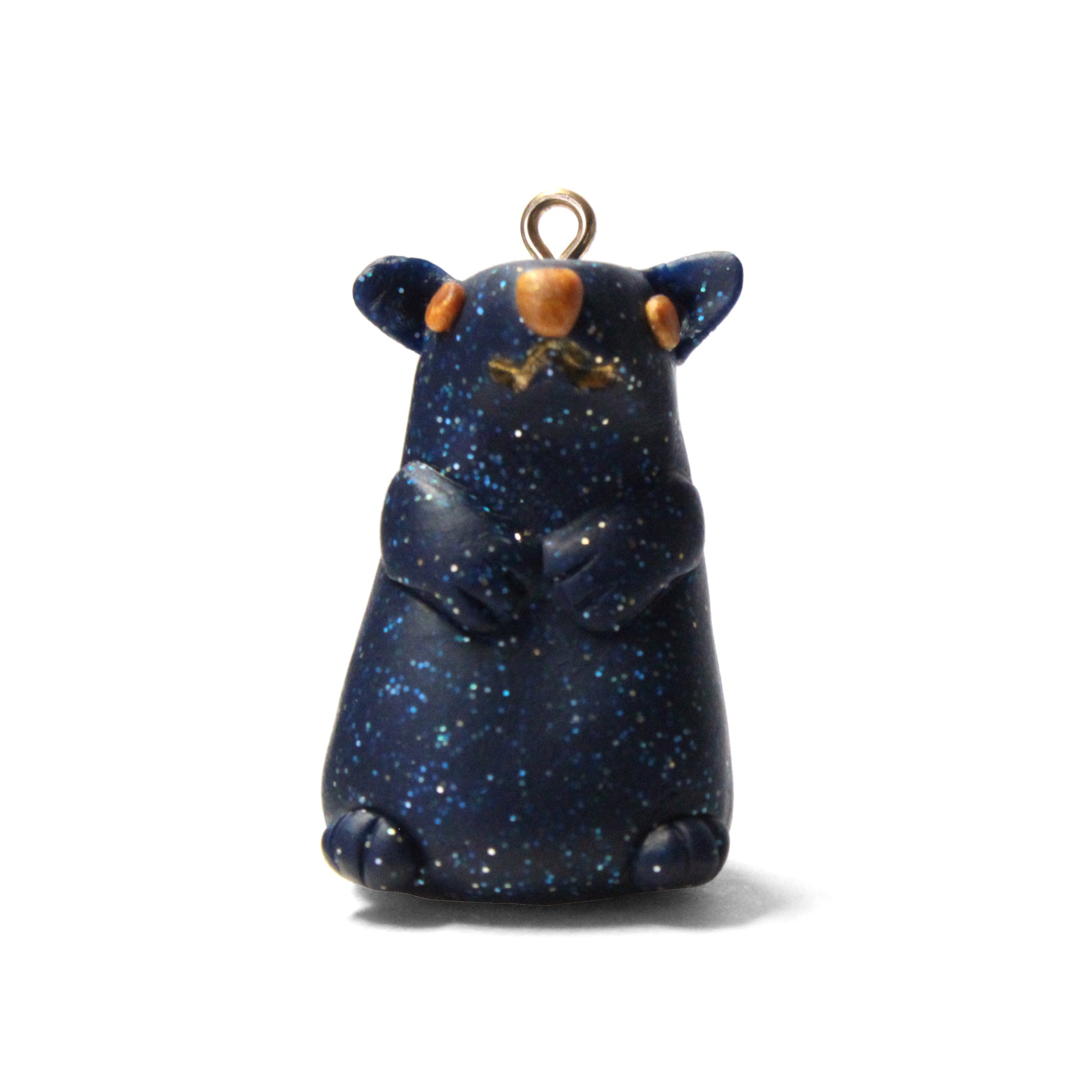 GALAXY HAMSTER Charm is a cute, loveable critter that eagerly sits and looks up at you with curiosity. Each hamster is hand-crafted individually from polymer clay and is a dark night blue with starry glitter. Each charm comes with an eyelet for attaching a jump ring. Use as a necklace charm, purse charm or attach to a keychain.