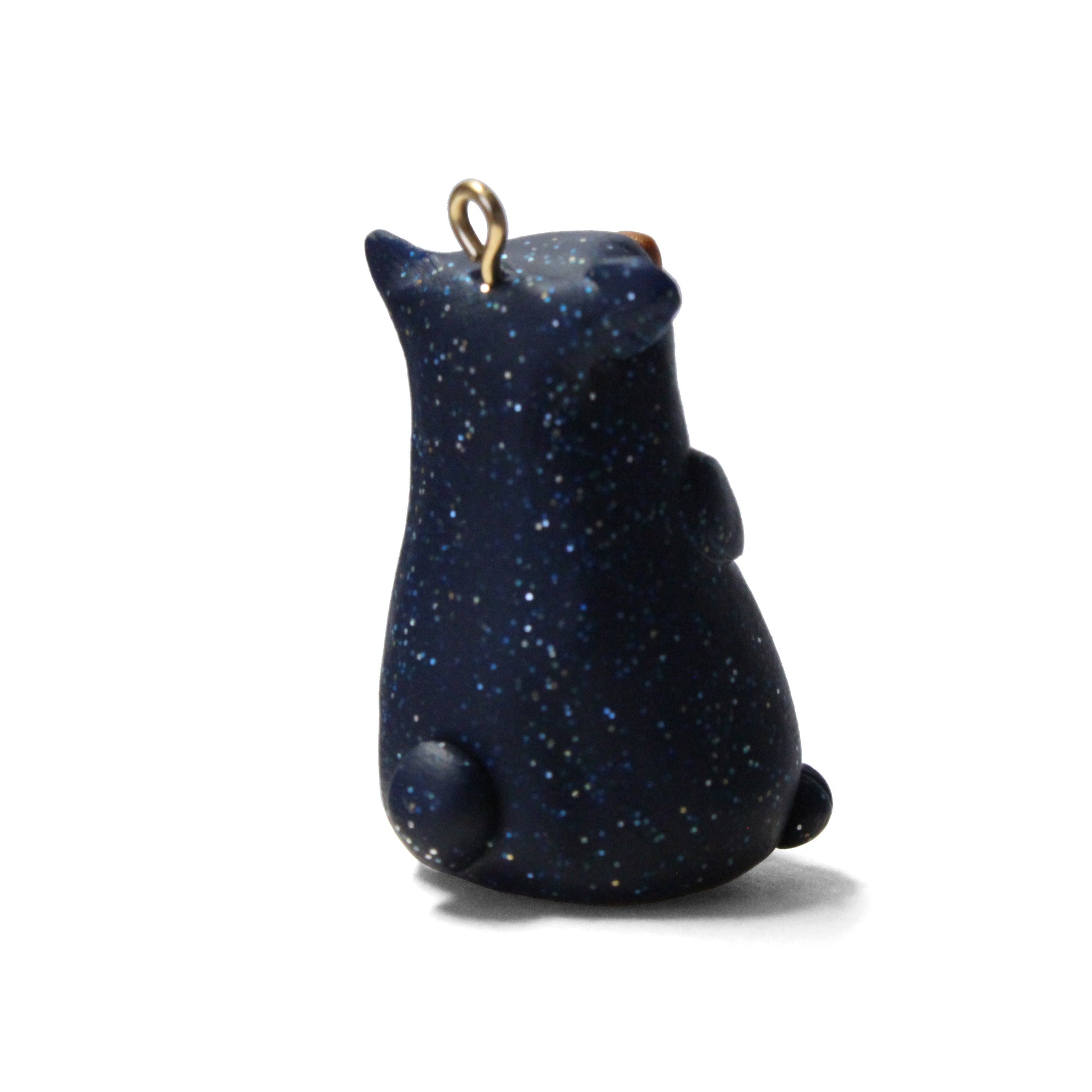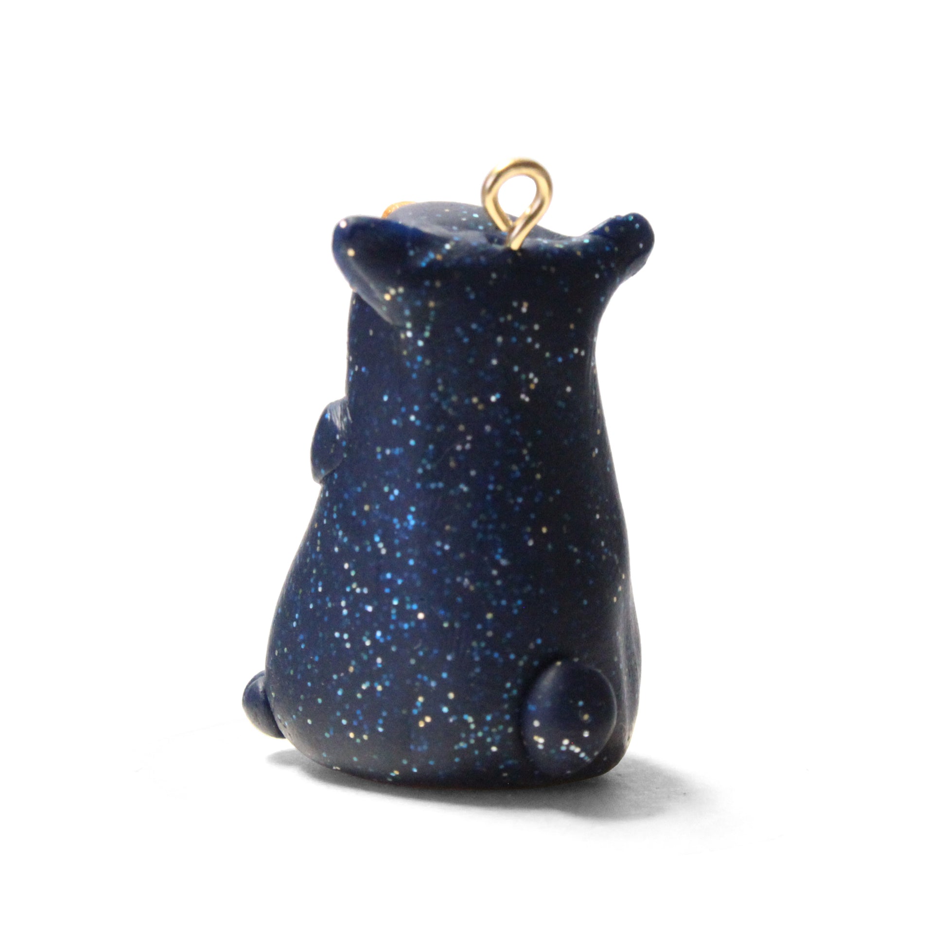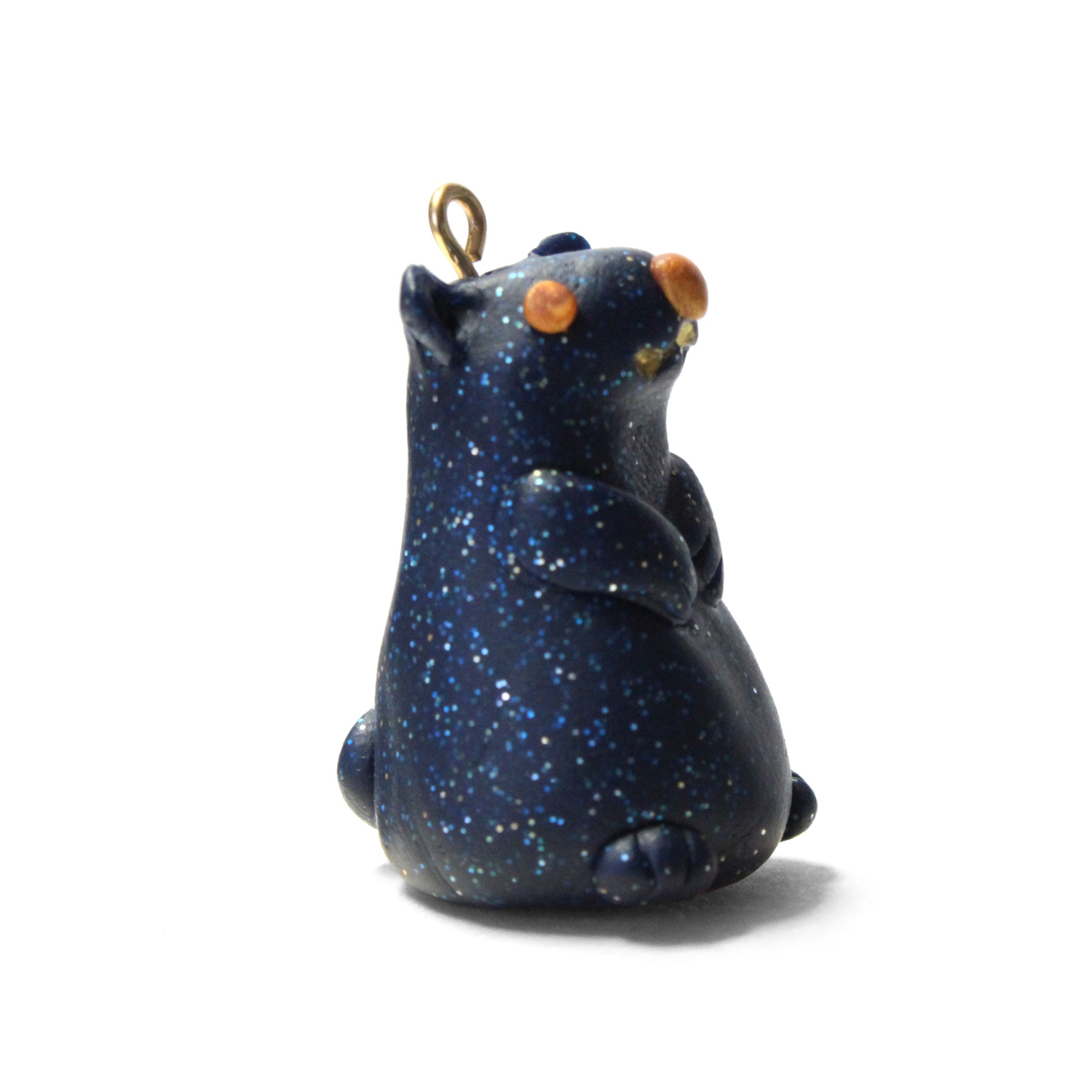 GALAXY HAMSTER Charm is a cute, loveable critter that eagerly sits and looks up at you with curiosity. Each hamster is hand-crafted individually from polymer clay and is a dark night blue with starry glitter. Each charm comes with an eyelet for attaching a jump ring. Use as a necklace charm, purse charm or attach to a keychain.