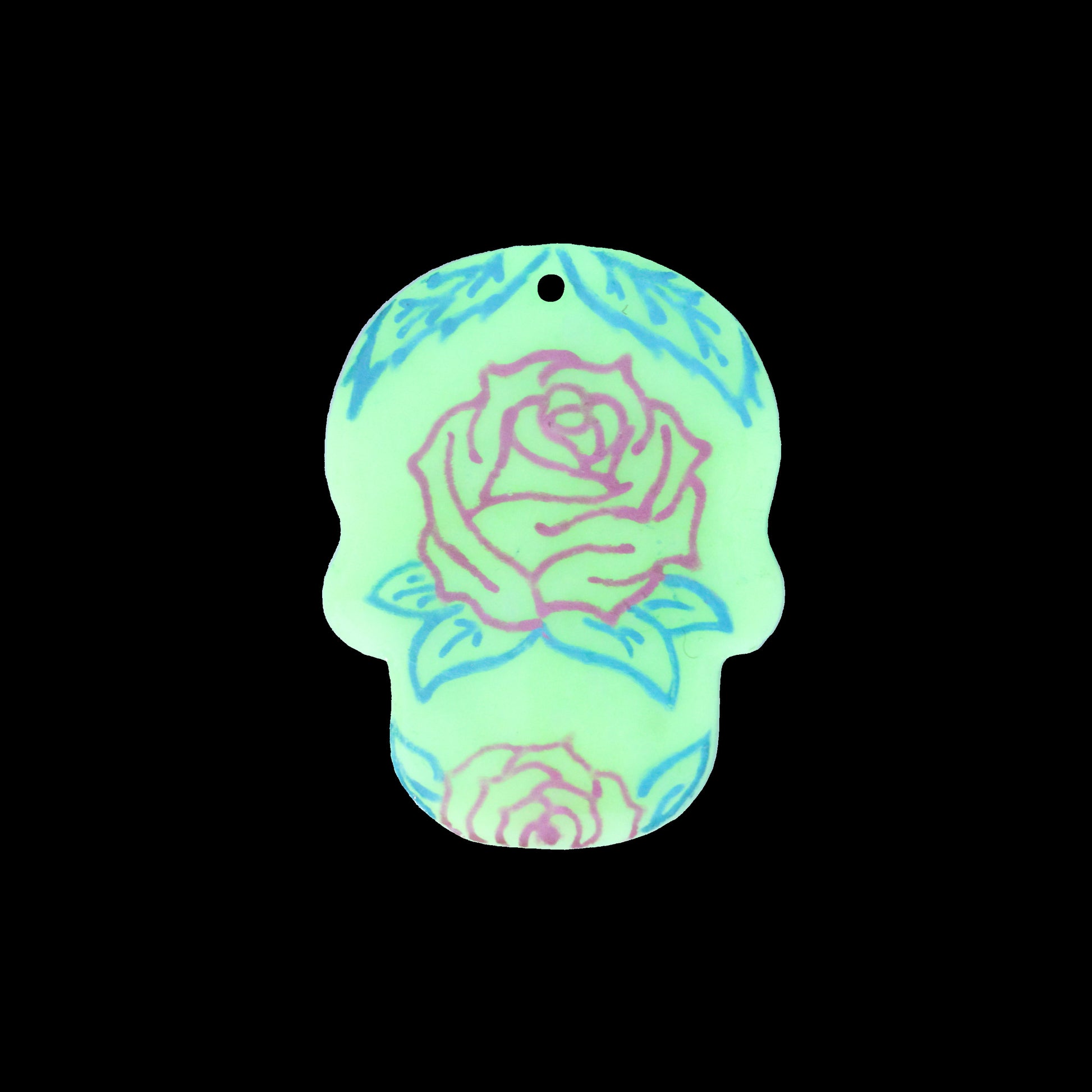 Add a touch of spooky elegance to your jewelry creations with this glow-in-the-dark Day of the Dead skull pendant. This uniquely designed polymer clay charm features rich detail on both sides—front: stylized sugar skull, back: rose motif—making it perfect for pendants, earrings, bracelets, or mixed media designs.