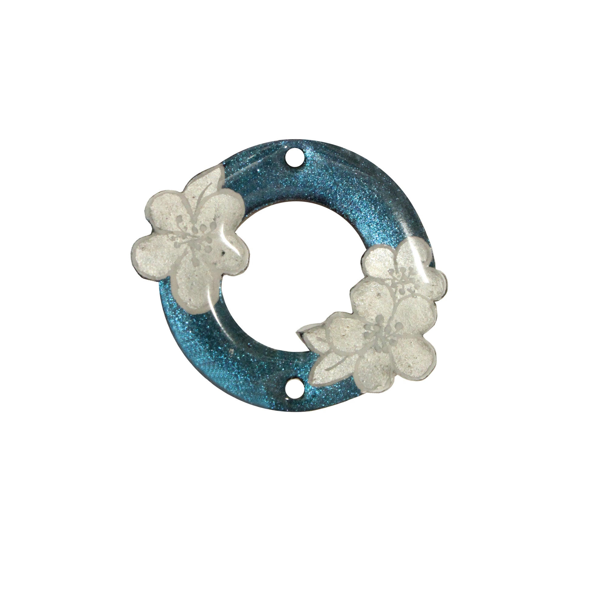 Flower Blossom 2 Hole Link is a ring shaped link with decorative fruit tree flower blossoms. Made of lightweight polymer clay, it boasts an iridescent blue hue that flashes to purple when turned. The link has silver colored flowers and leaves and has two thread holes - one on either side - for easy attachment. Use it as a fun and unique link on a spring or summer themed jewelry project.