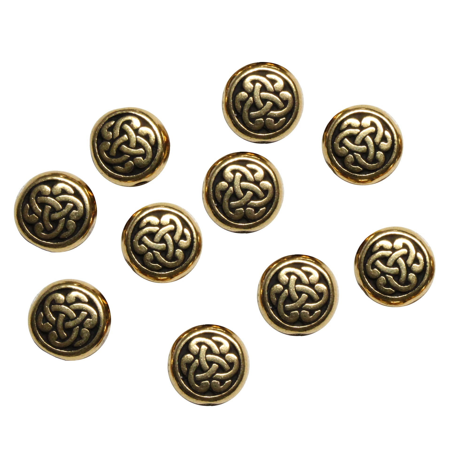 Pewter Circle Triad Bead with a plated finish designed and manufactured by TierraCast. This ornate bead has a celtic knot pattern on each side of the bead. Each bead is 9.5mm (diameter) and 4mm Thk.