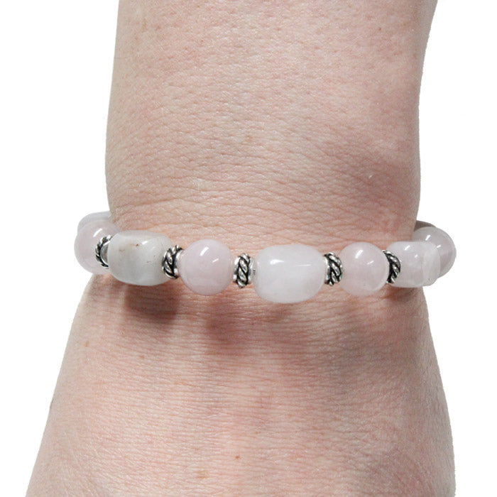 Rose Quartz Memory Wire Bracelet features alternating round and nugget beads separated by antique silver spacers. Rose quartz is possibly the most desirable quartz gemstone (excluding amethyst which is actually purple quartz). The bracelet is finished with an extender chain ending in a lotus charm. The lotus charm has the silhouette outline of the iconic symbol for beauty and purity - the lotus flower.