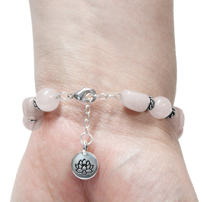 Rose Quartz Bracelet with lotus charm / 6 to 7 Inch wrist size / extender chain