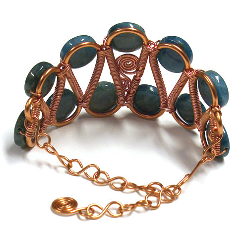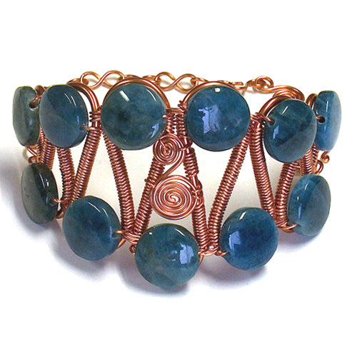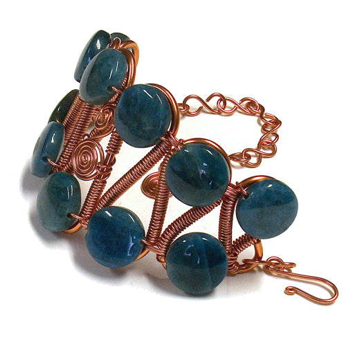 Blue Apatite Wirework Cuff Copper Bracelet features lovely lagoon blue apatite beads lovingly coiled onto a copper wire frame. Decorative scrolling wirework along with a handmade clasp and chain combine to give this bracelet a beautiful look and feel for enthusiasts of handmade jewelry. This style is similar to a cuff bracelet and because it has a wire frame, is very flexible and easy to wear. A stylized extention chain is included to safely secure the bracelet to the wrist.