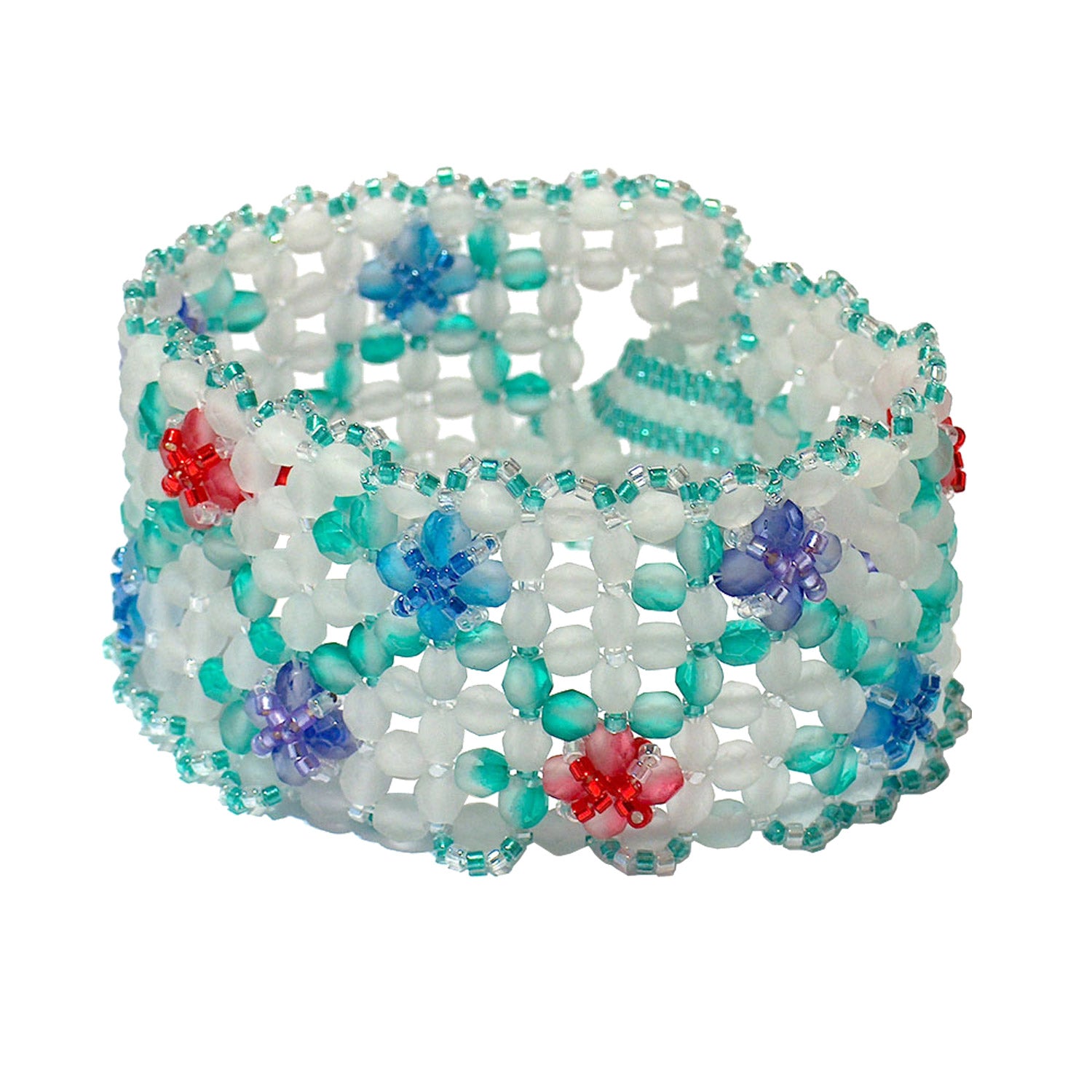 Flowers in Glass Bracelet is a beadwoven bracelet with delicate beaded flowers on an icy look crystal background. The flowers are purple, red and blue with emerald green leaves and sparkle highlites. The bracelet has a matte crystal background with a sparkly green and crystal edging. Stretched out, the bracelet is 1-3/8" (35mm) wide and 8" (205mm) long including the toggle clasp.