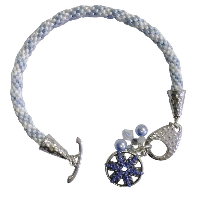 Winter Snowflake Kumihimo Bracelet is made with winter white and light blue cord ending in a glittery blue snowflake charm. The kumihimo cord is a satin cord with a spiral blue and white pattern. This cord ends with two pewter hammertone cones and a similarly-finished ellipse toggle clasp. The pendant is a pewter snowflake with a silver finish. A hand-applied blue glitter was carefully added to one side of the snowflake and finished with a protective sealer. Crystal pearls and beads were added for a little extra sparkle.