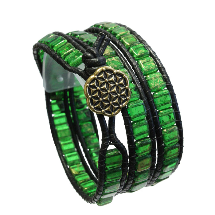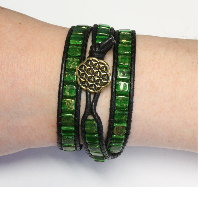 Flower of Life Triple Wrap Bracelet / fits 6.5 to 7 Inch wrist size / green glass and black leather cord / button closure