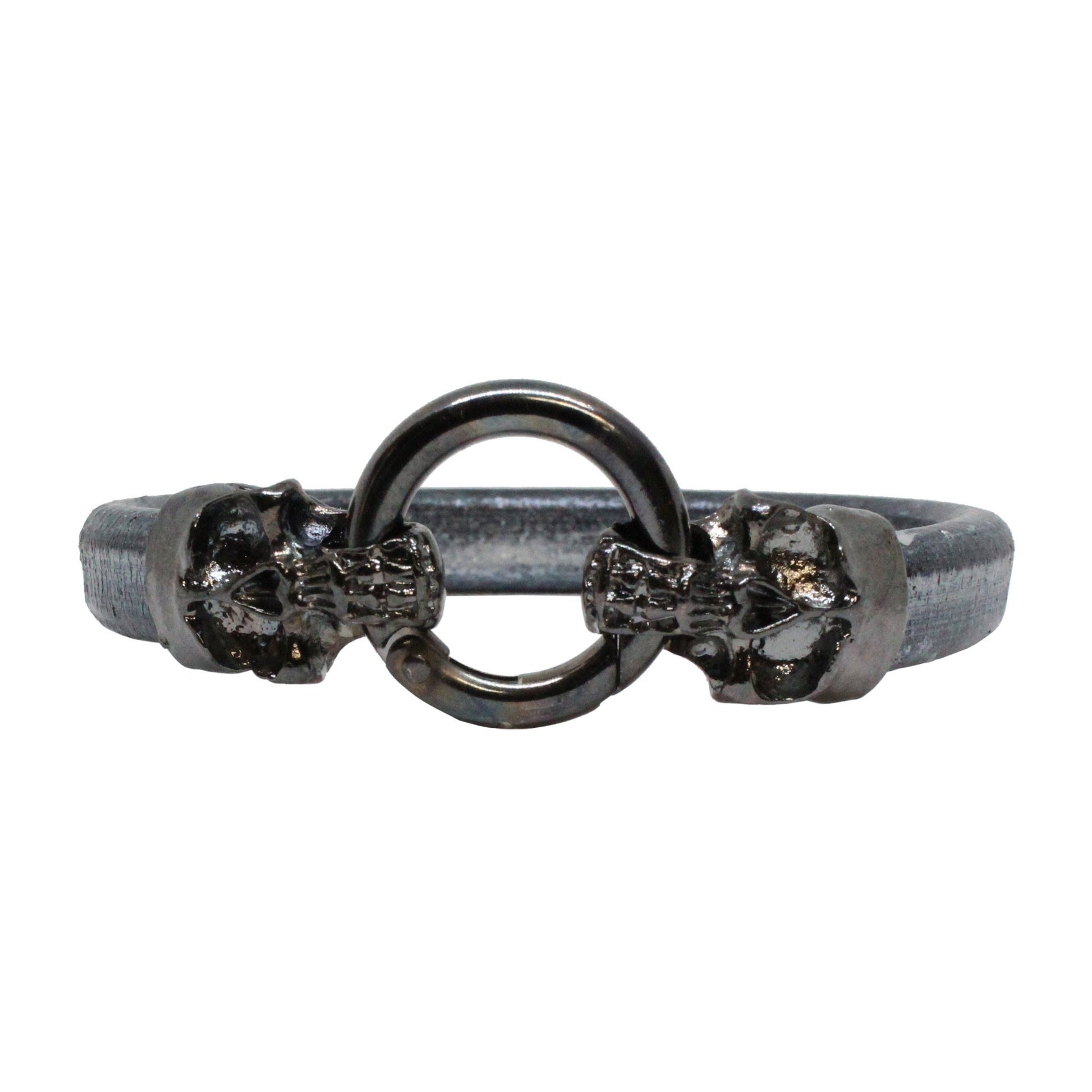 Skull & Ring Bracelet — Grey Leather Cord with Double Skull Hinge Clasp | 7.5″ Unisex Halloween Bracelet