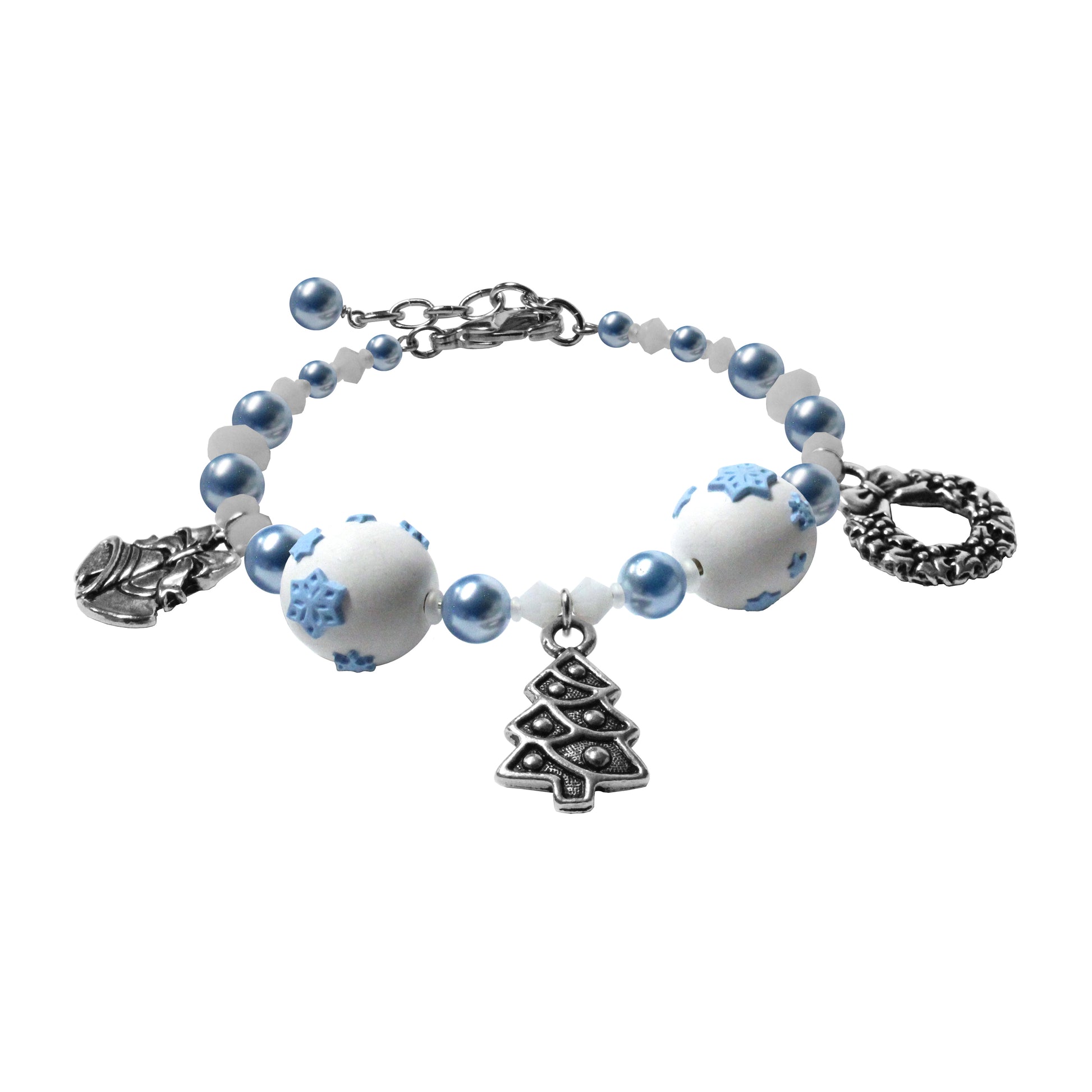 Three iconic Christmas charms dangle from this Christmas Holiday Charm Bracelet: silver bells, a pine tree decorated with ornaments, and a holly wreath. Frost-white crystal bicones and light blue crystal pearls call imagery of winter mornings to mind. The snowy scene is completed by the addition of our handmade beads featuring tiny snowflake embellishments. Enjoy this miniature, wearable winter scene all season long.