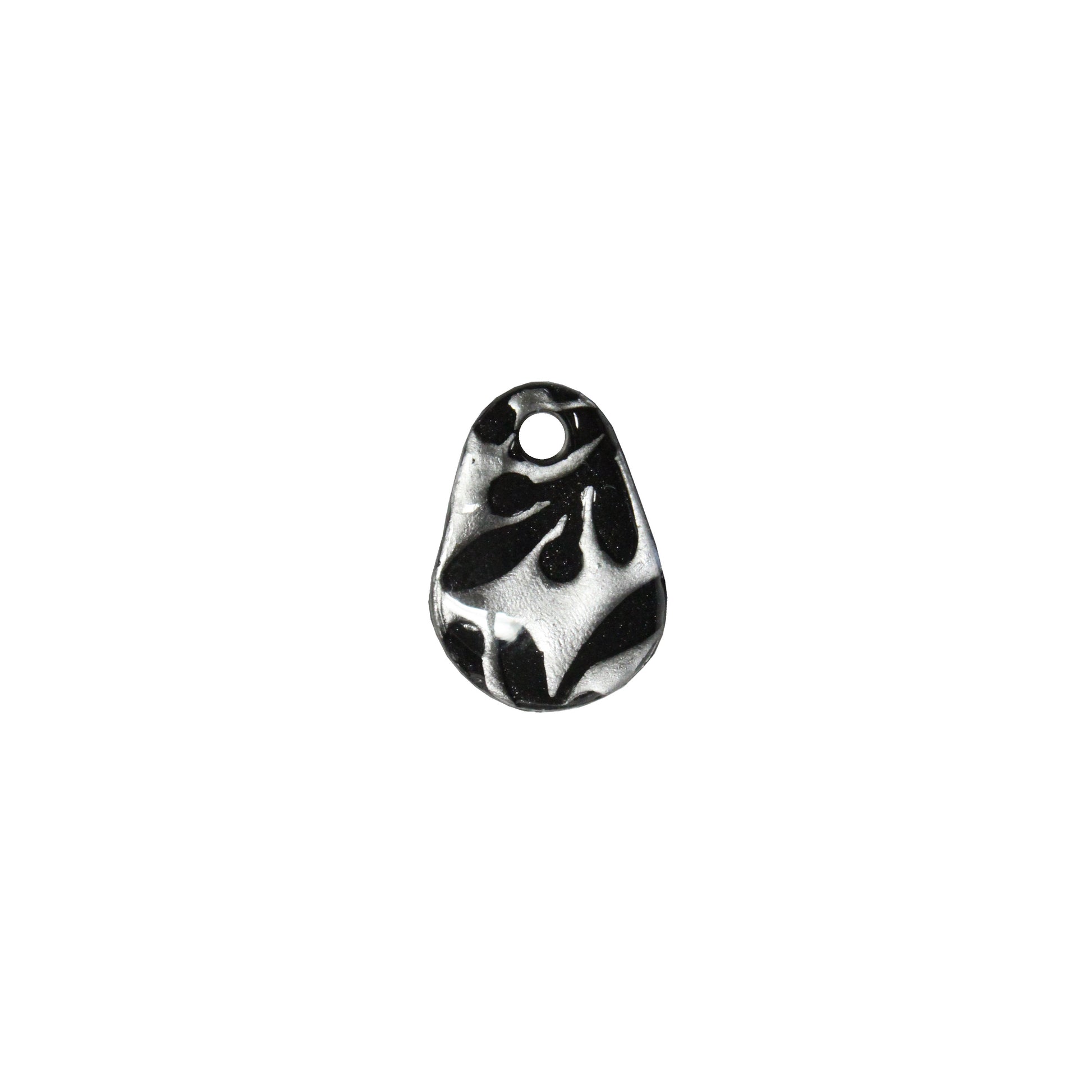Small Flora Teardrop Charm is a lightweight polymer clay charm with black leafy flower patterns on a silver background. The charm is teardrop shaped with a thread hole at the top for adding a jump ring or bail. This is a one sided charm with the reverse black with a raised pattern.