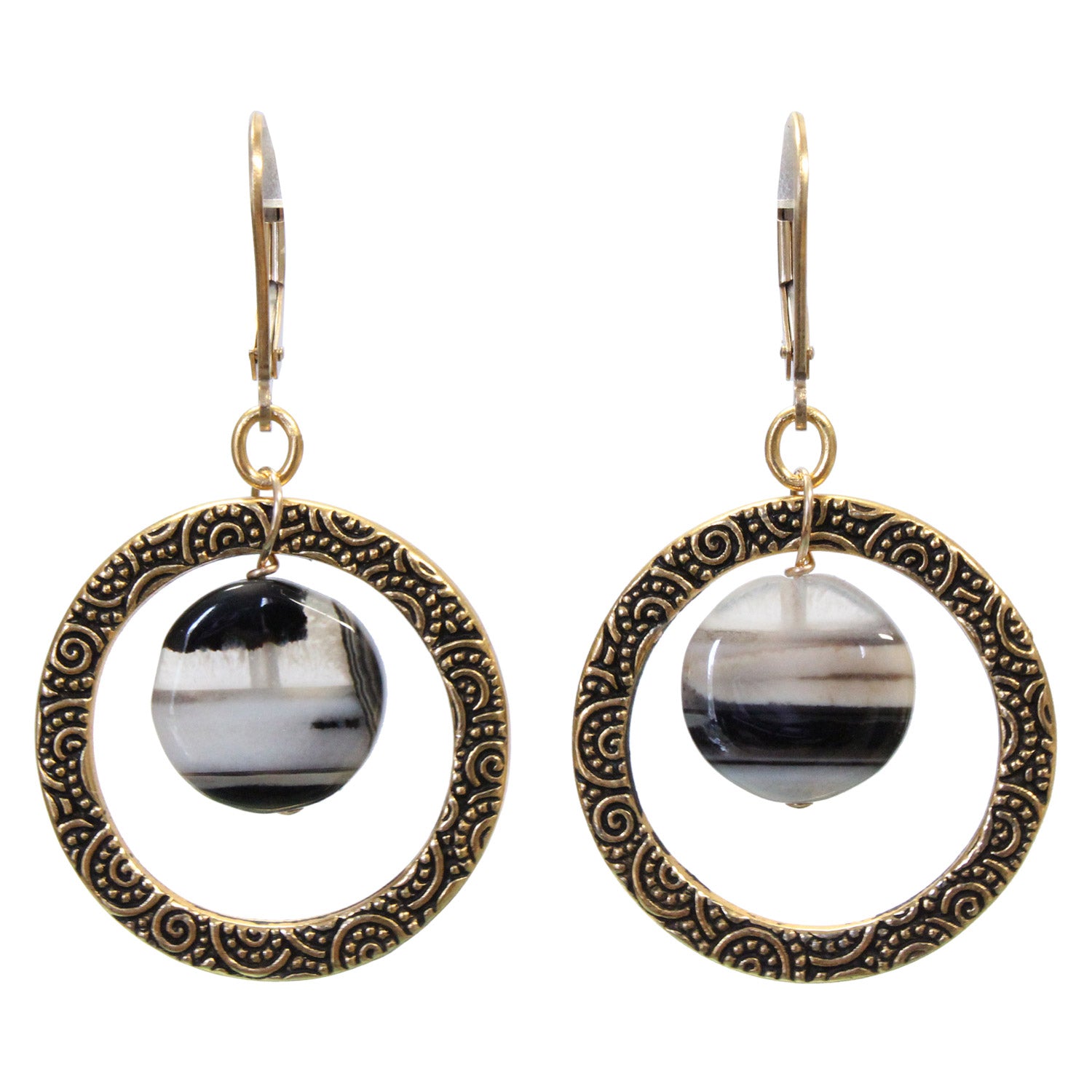 Sardonyx in Rings Earrings are made with 12mm sardonyx coin beads which are a beautiful shiny black with milky striping, making these earrings special. The rings are large 25mm diameter pewter rings with an antiqued gold finish. The geometric circle ring represents forever as a ring has no beginning and no end. These are natural stone beads and no two are alike. The earwires are gold filled leverback earwires.