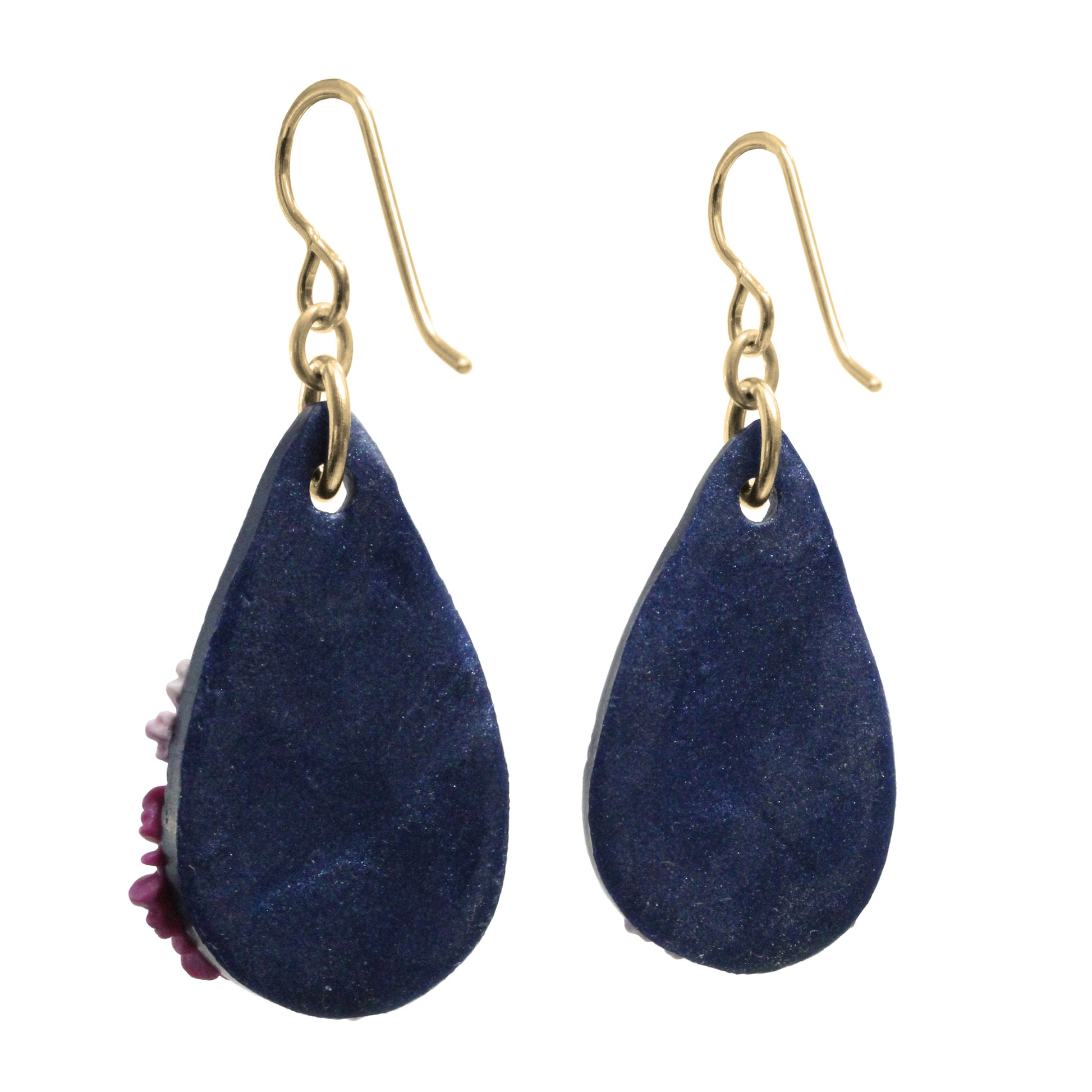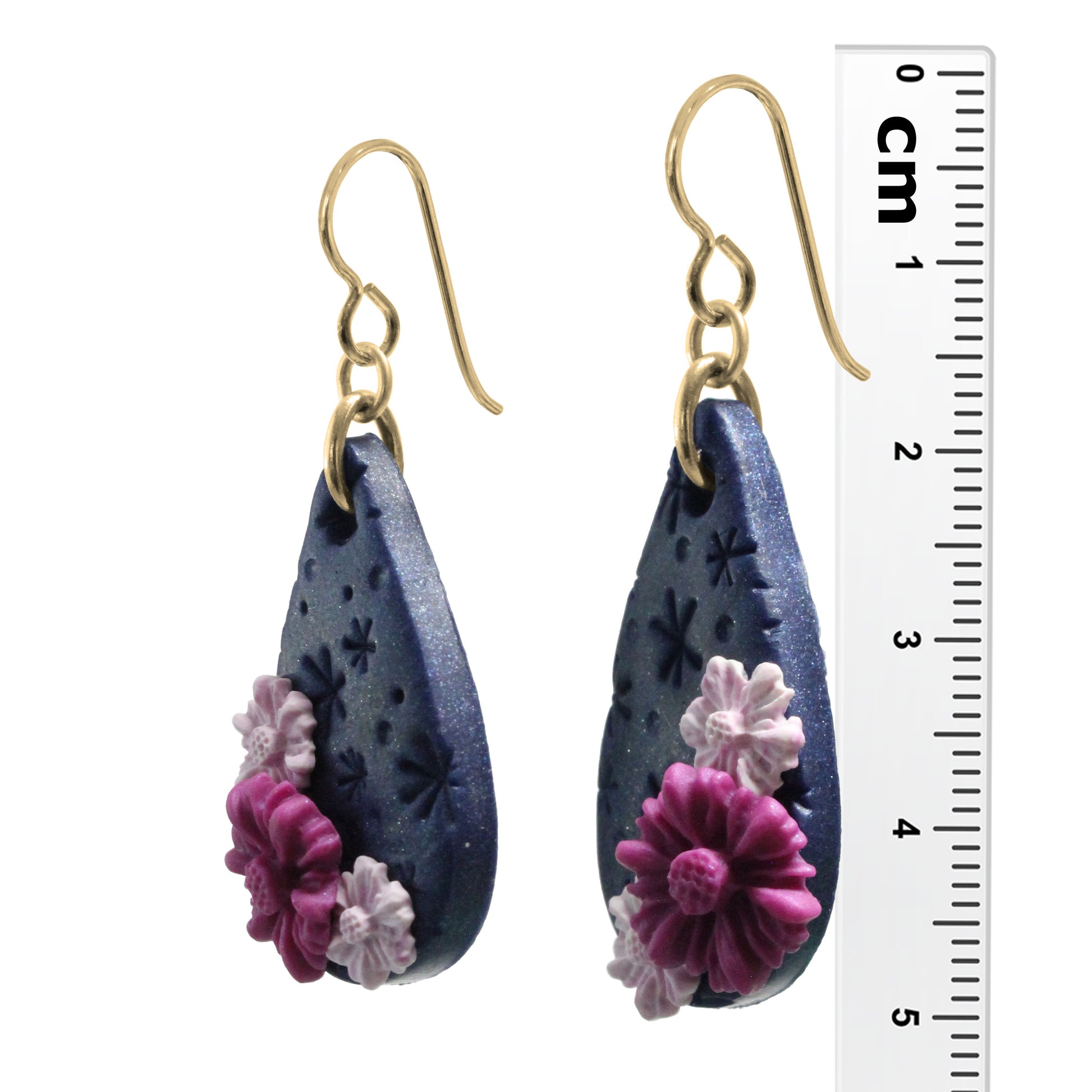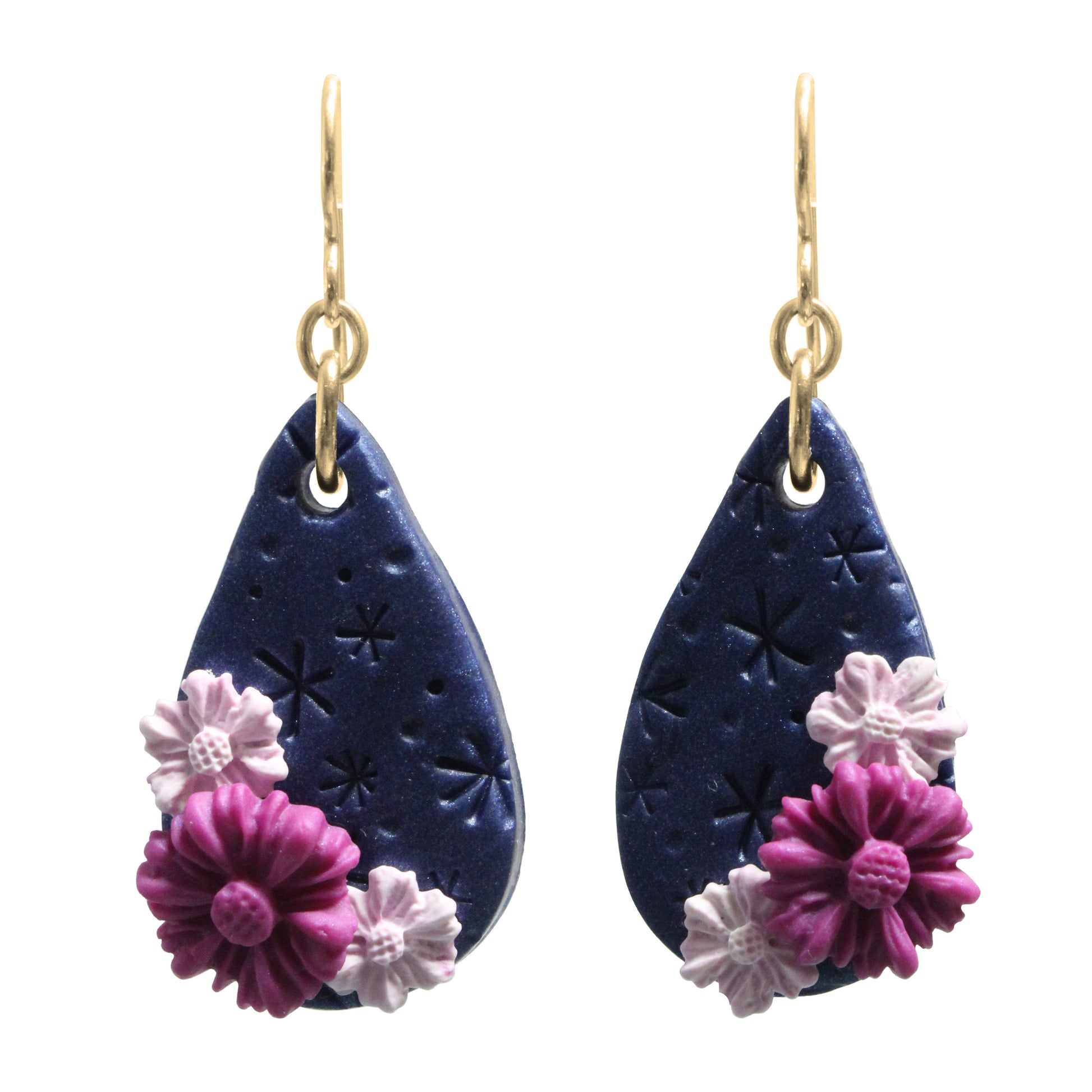 Spring Nightfall Flower Earrings paint a picture of spring nightfall – sky speckled with shimmering stars, cherry blossom pink and vivacious magenta flowers tumbling down in teardrop-shaped beauty!