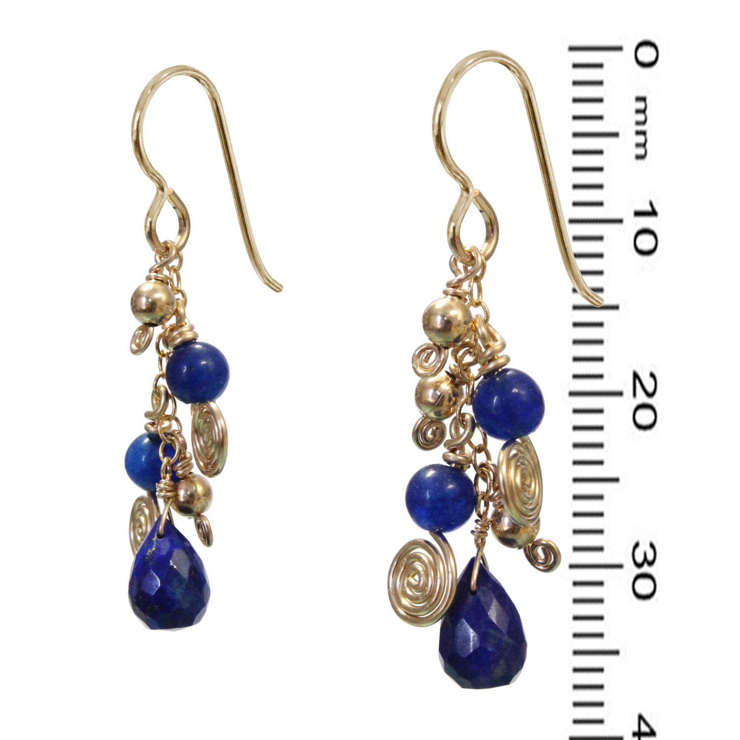 Galaxy Blue Lapis Earrings feature natural lapis briolettes among a cascading cluster of galaxy-shaped spirals and shiny round beads. The lapis drops are heat-treated 8x6mm hand-faceted opaque briolettes. These earrings come with hook earwires.