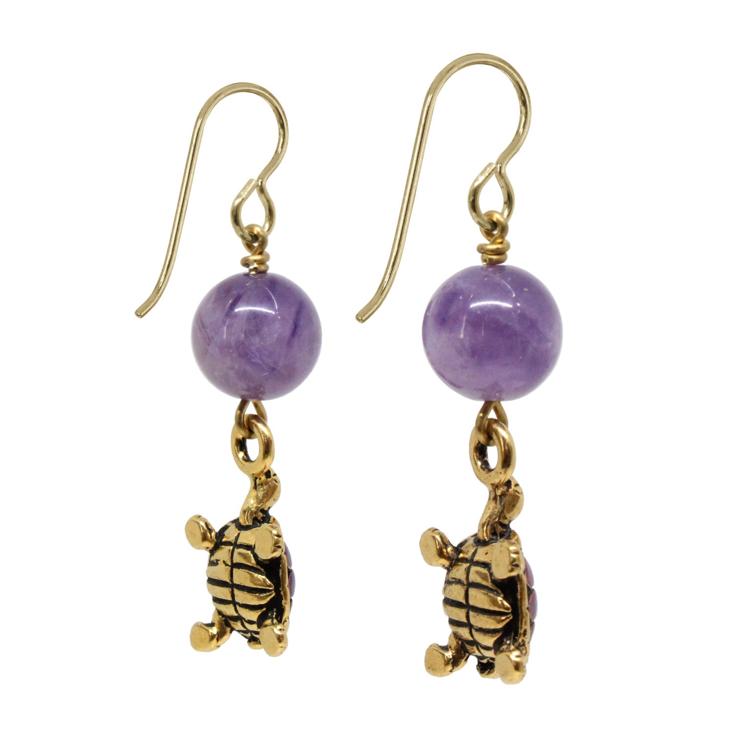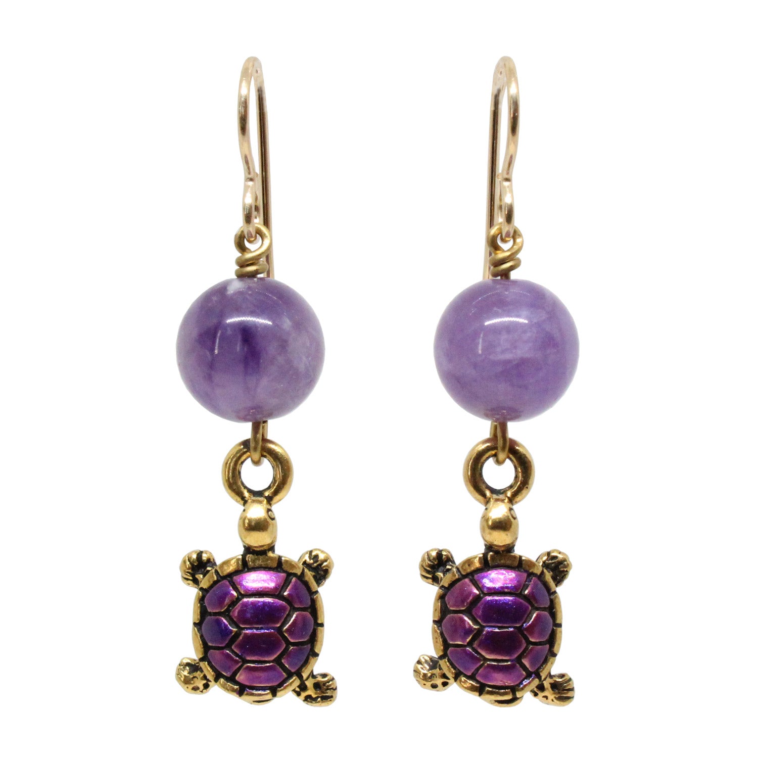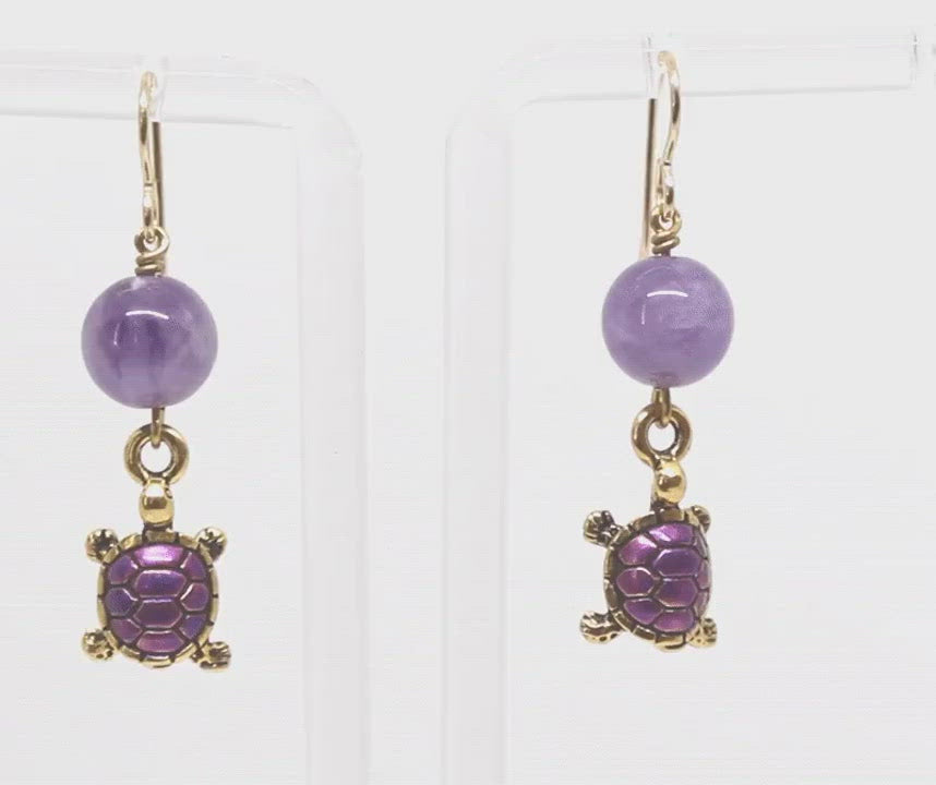 Turtle Earrings are adorned with amethyst beads above hand painted turtle charms. The charms are intricately detailed gold plated pewter turtles with decorative hand painted purple shells. The earwires are gold filled hooks.
