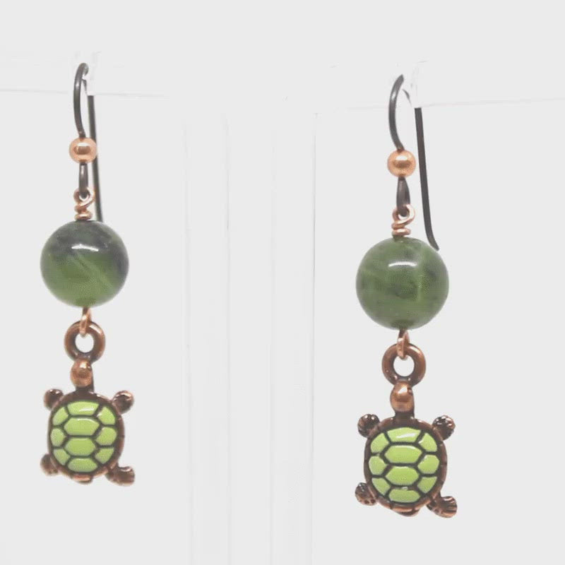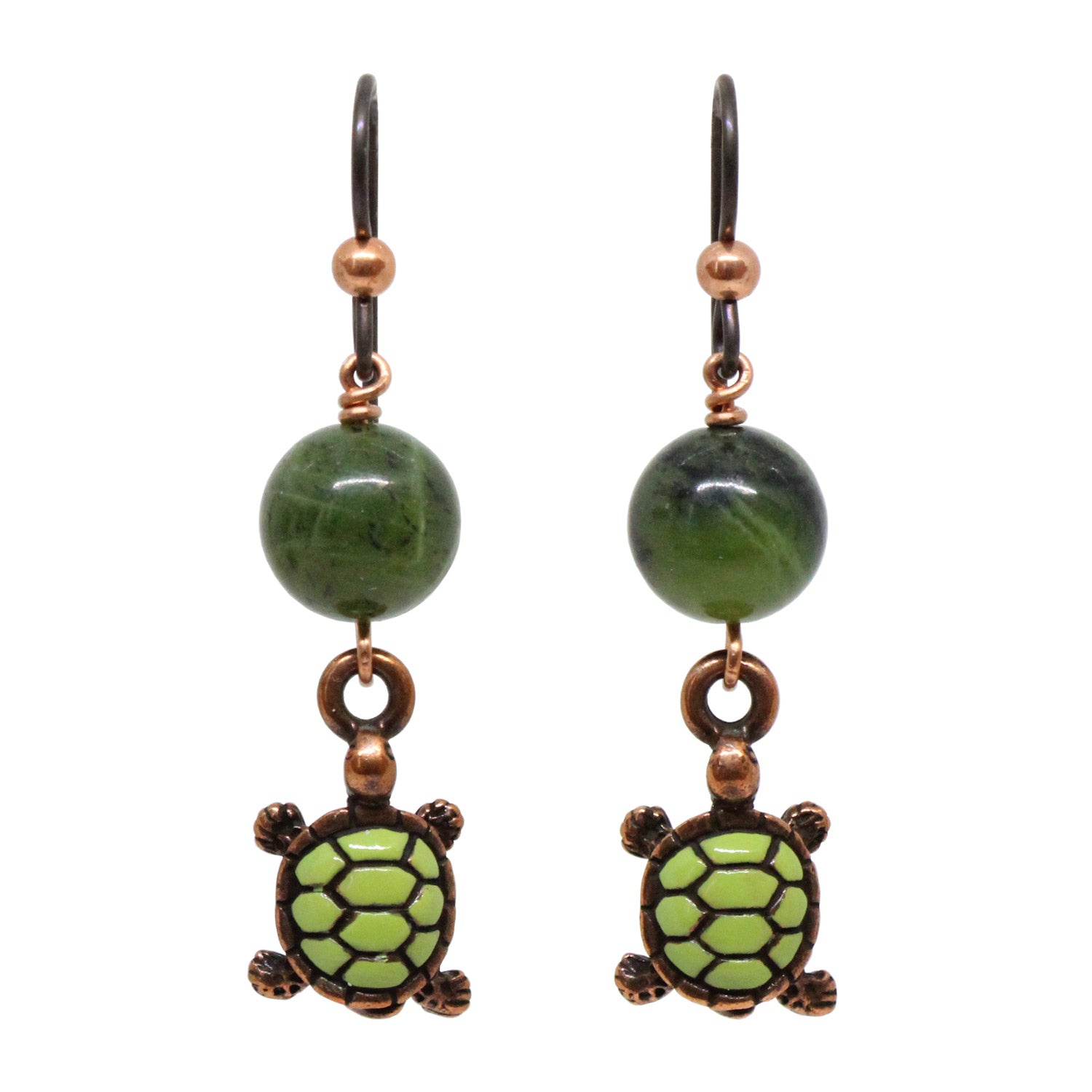 Turtle Earrings are adorned with green serpentine (Canadian Jade) beads above hand painted turtle charms. The charms are intricately detailed copper plated pewter turtles with decorative hand painted green shells. The earwires are antique copper niobium hooks with a decorative bright copper ball.