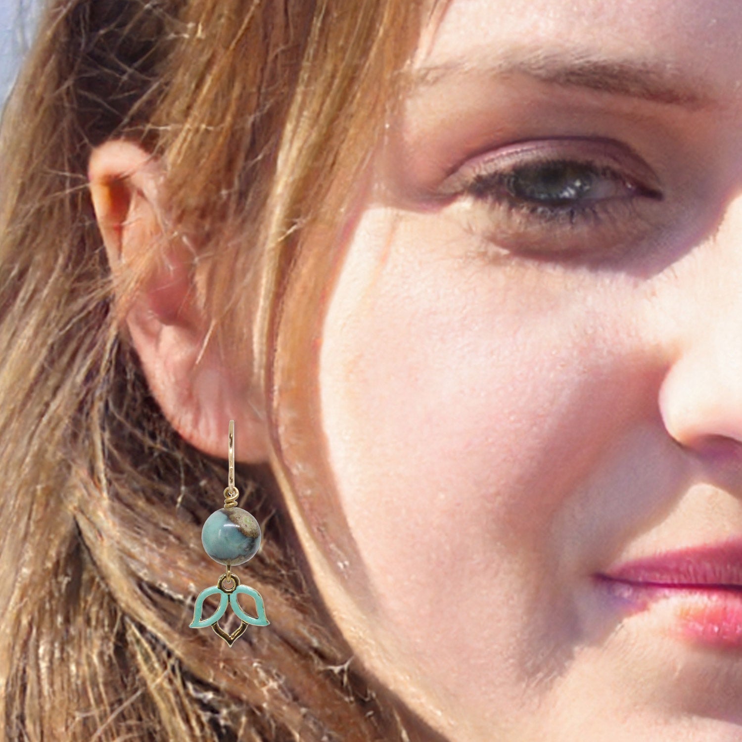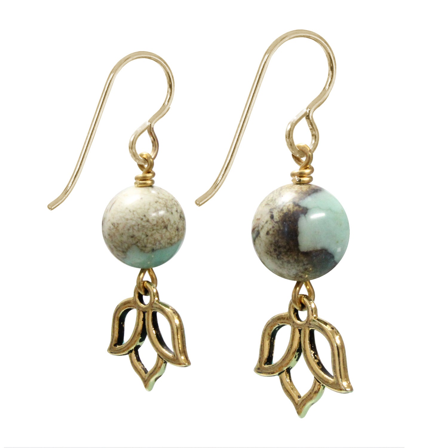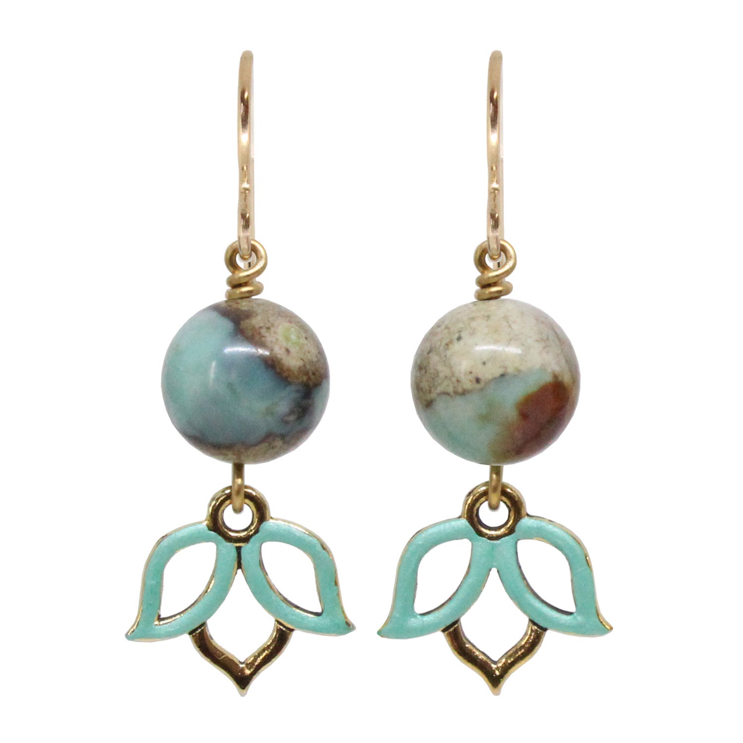 Terra Agate Earrings are adorned with beautiful earth colored agate beads above inverted open lotus silhouette charms. The lotus charms are partially hand painted on the front to give the overall appearance a little added touch of color. The lotus charm is the silhouette outline of the iconic symbol for beauty and purity - the lotus flower. The earwires are gold filled hooks.