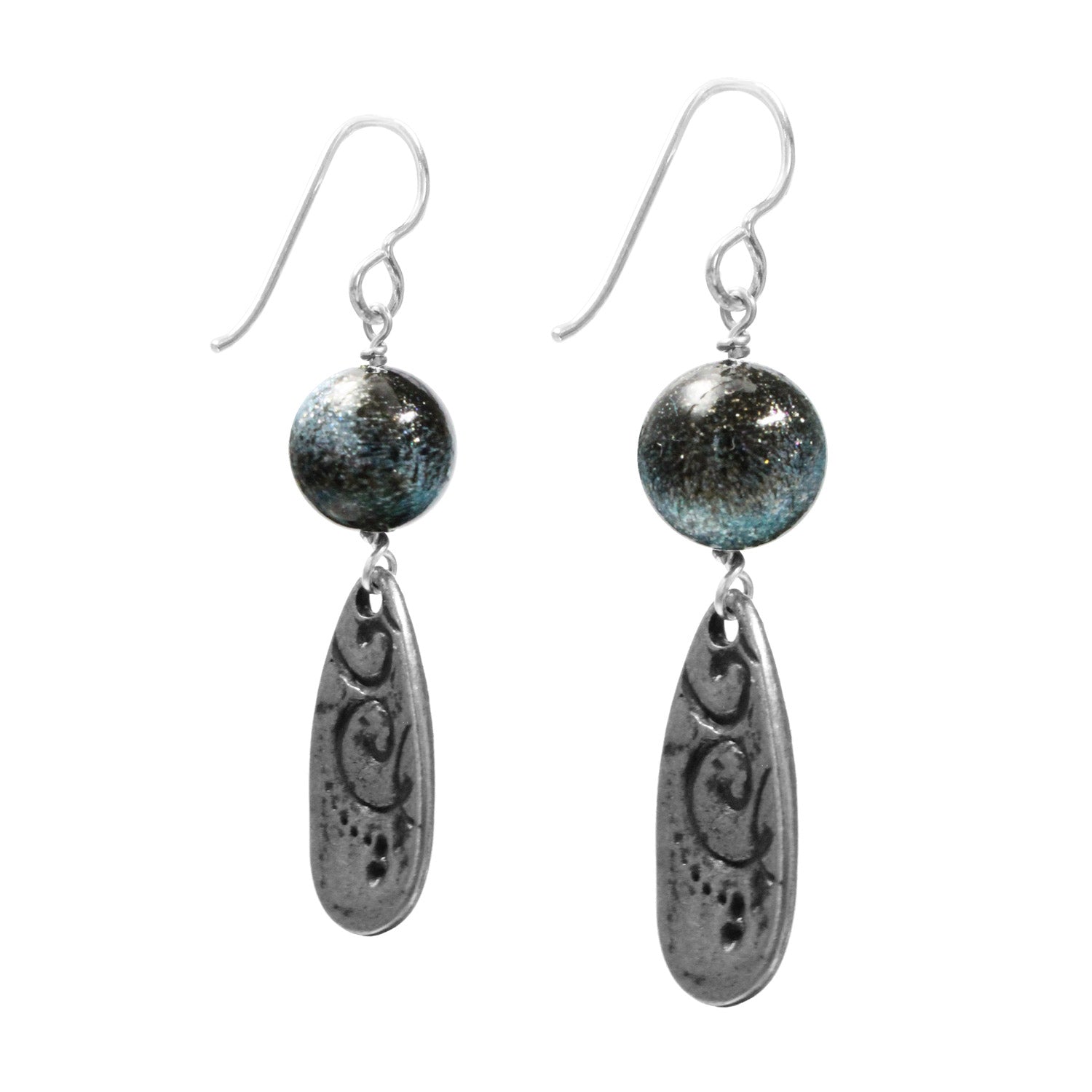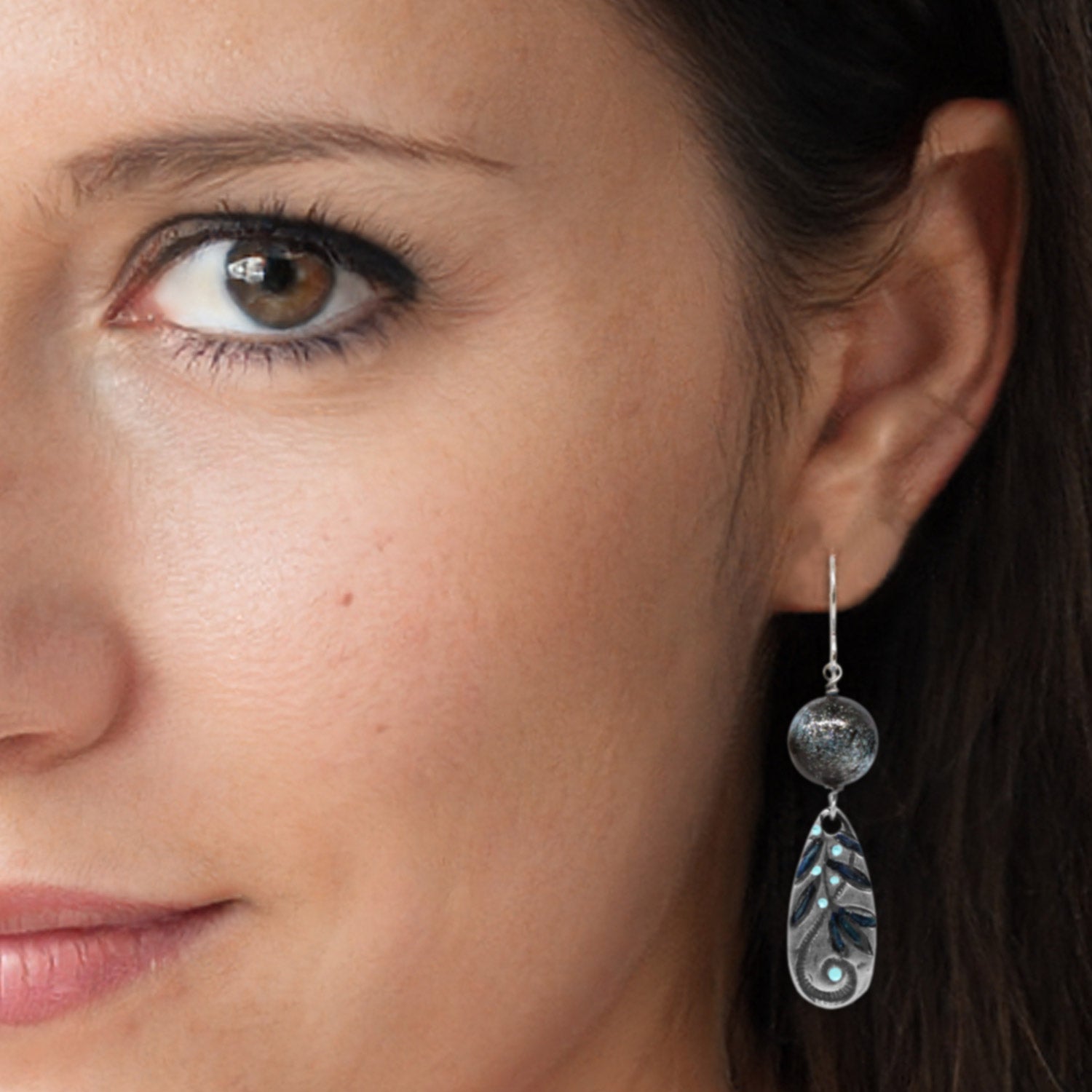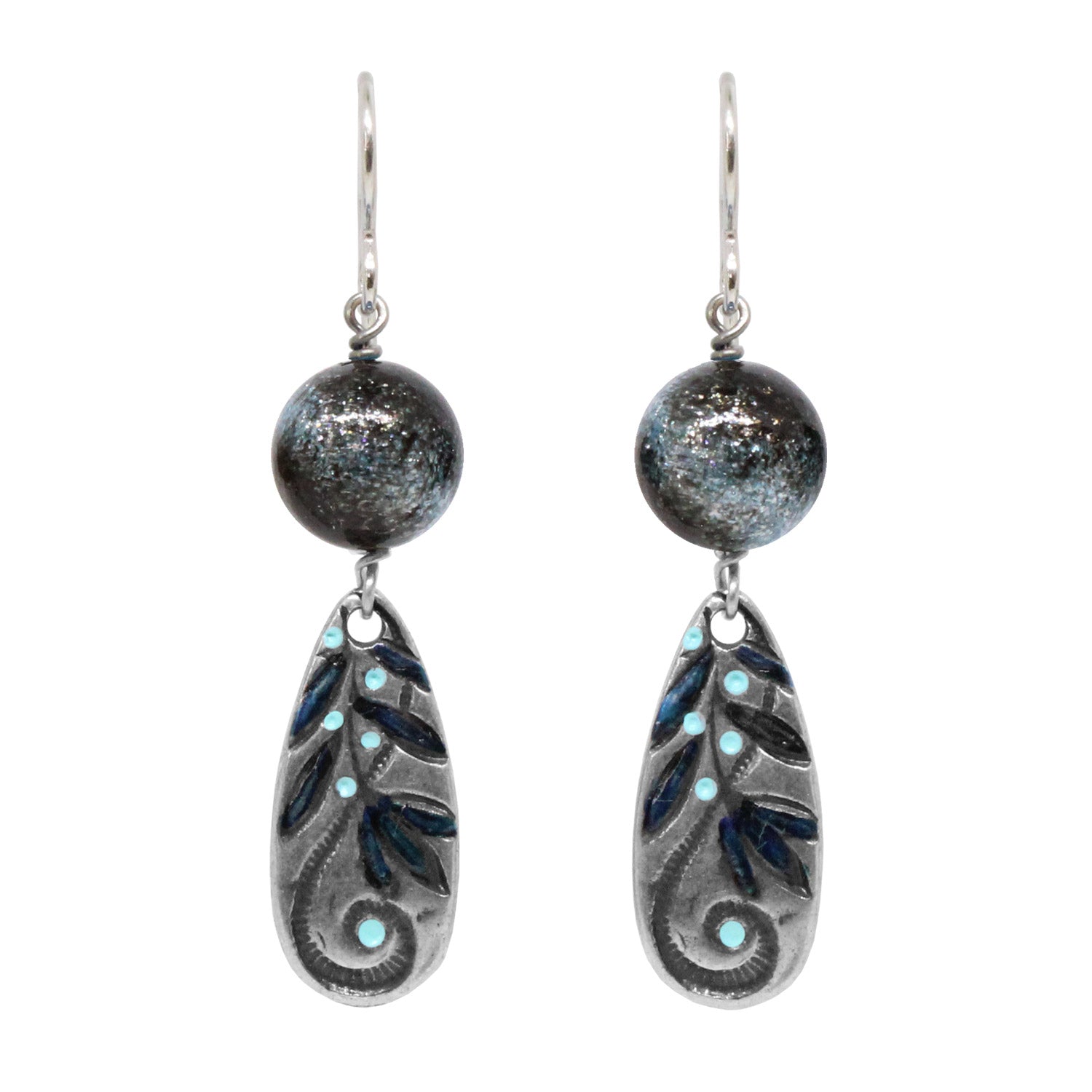 Flower Constellation Earrings are adorned with Miyuki galaxy beads above floral patterned teardrop charms. The galaxy beads were designed remind you of the deep Galaxy and the Milky Way. The charms are two sided with floral patterns with hand painted highlights simulating a flower constellation. The earwires are sterling silver hooks.