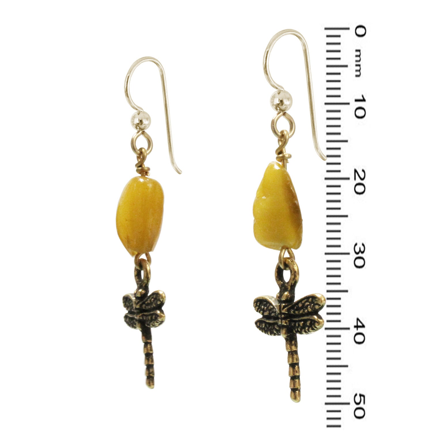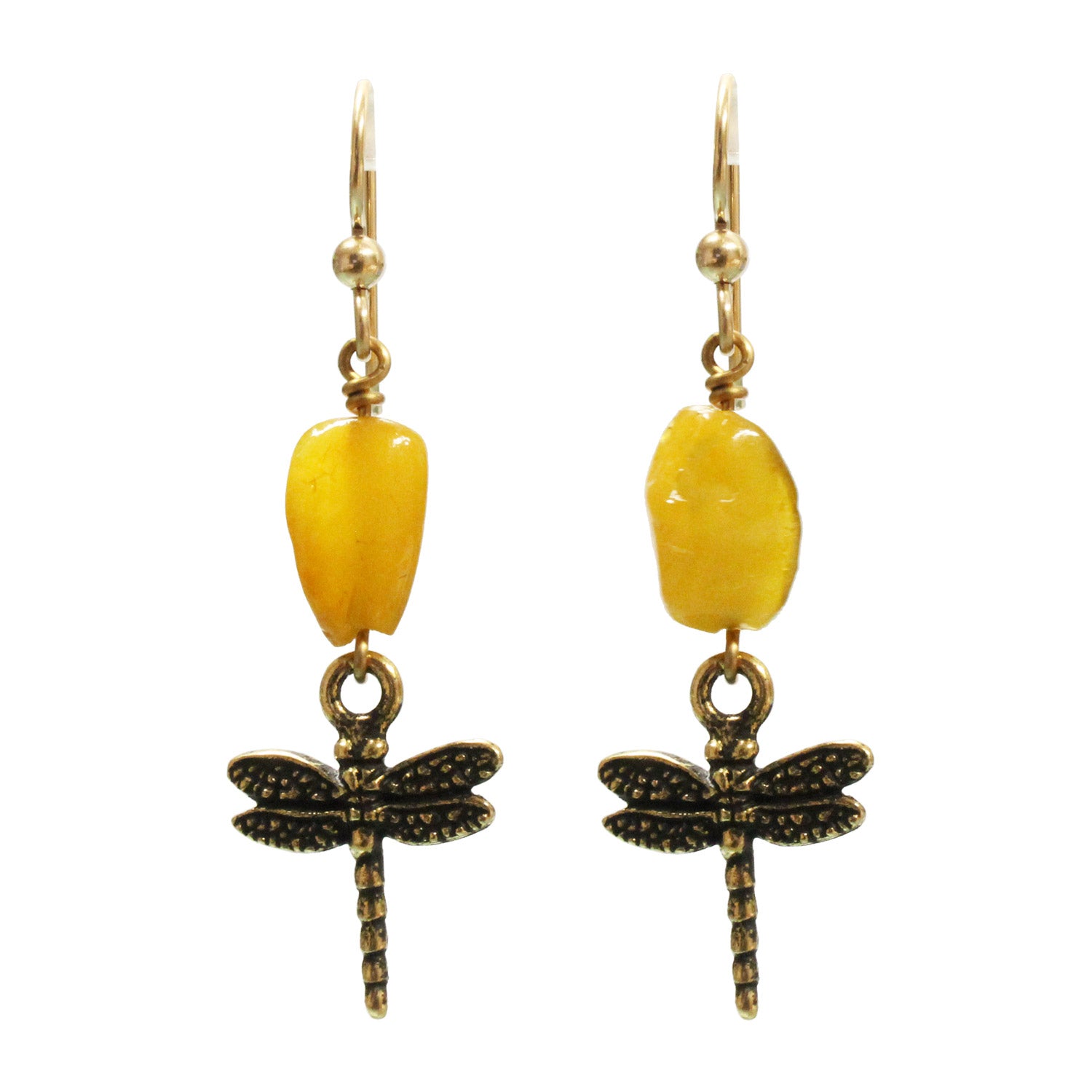 Dragonfly Amber Earrings are created with beautiful dragonfly pendants below natural amber nugget beads. These beads are with a honey mustard opaque coloring. The earwires are gold filled hooks with a decorative ball.