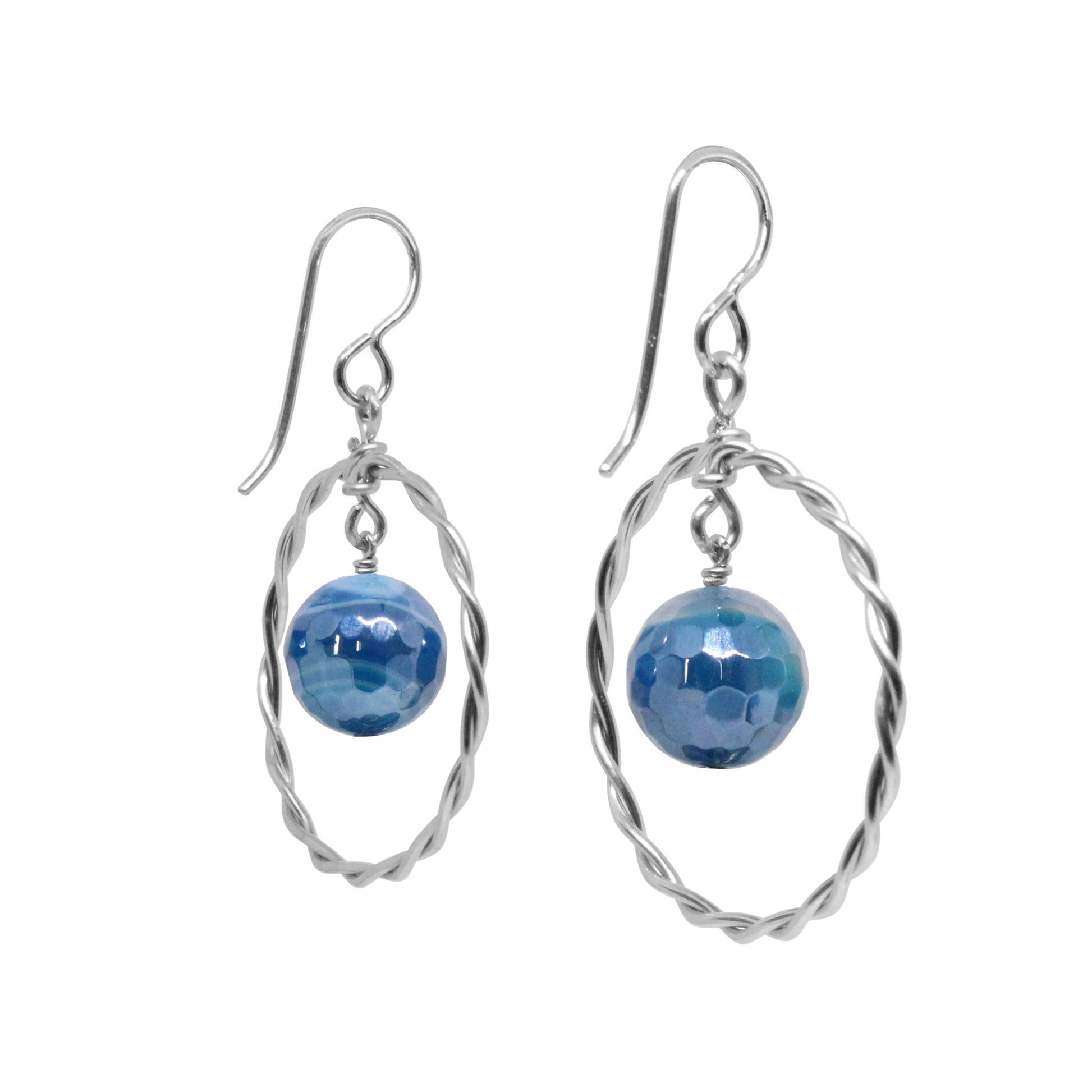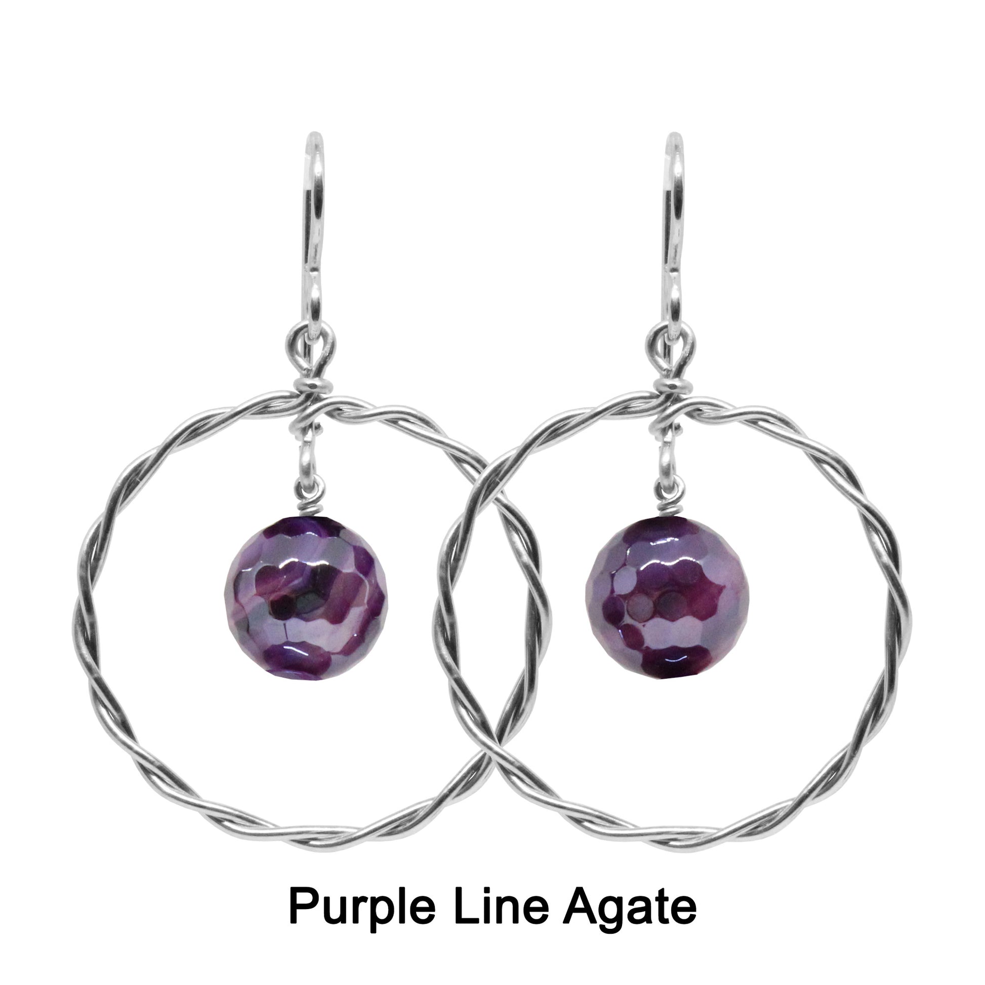 Twisted Wire Hoop Earrings feature a wire hoop encircling a gemstone bead of your choice. These beads are 10mm faceted round beads coated with a silver luster finish (super shiny). These natural agates are dyed or heat-treated enhancing the swirling or banding patterns and creating a vivid coloration. Each hoop is made with hand spun twisted sterling silver wire and is 25mm inside diameter. The earwires are sterling silver hooks.