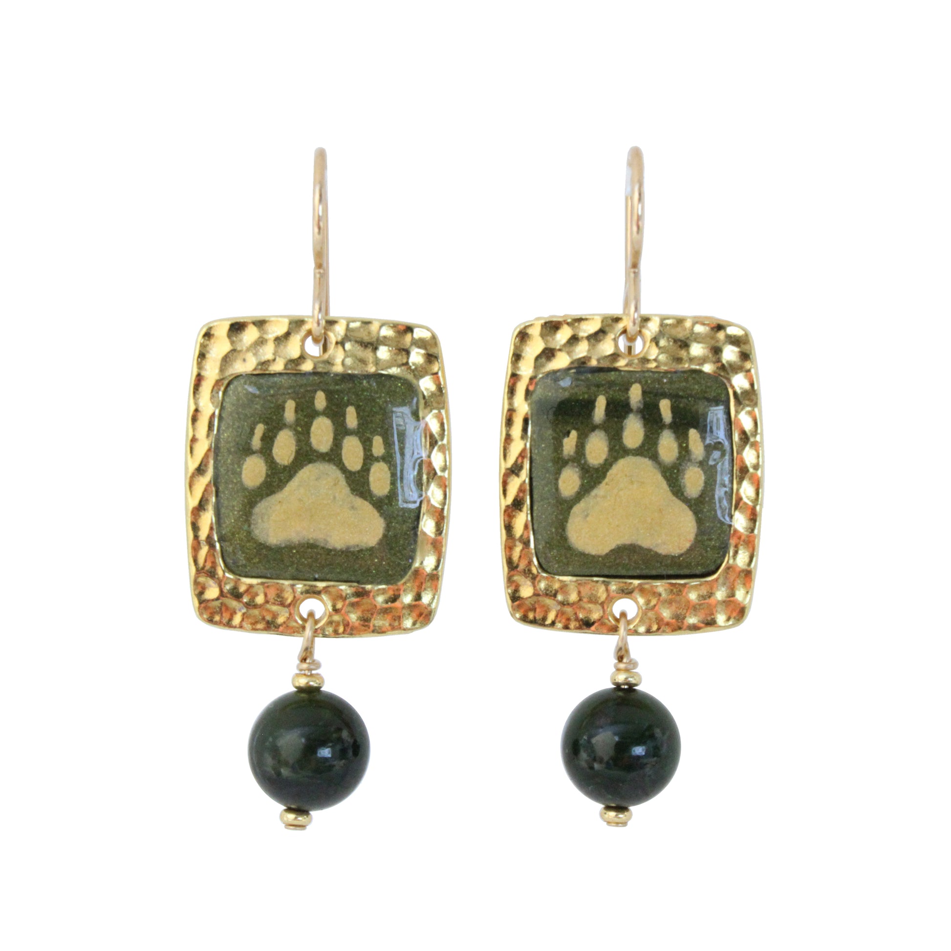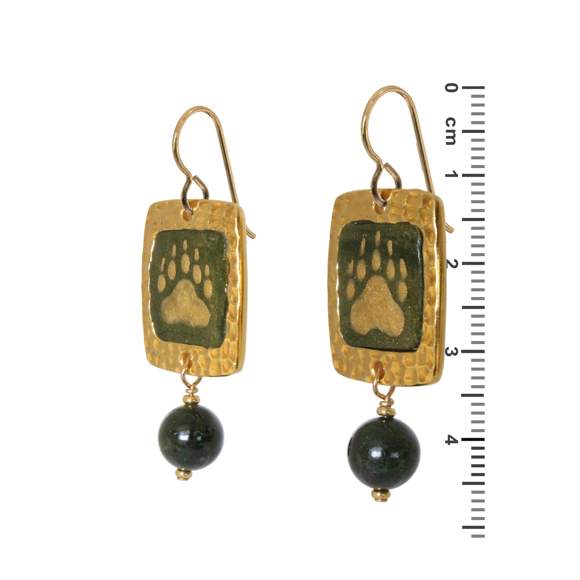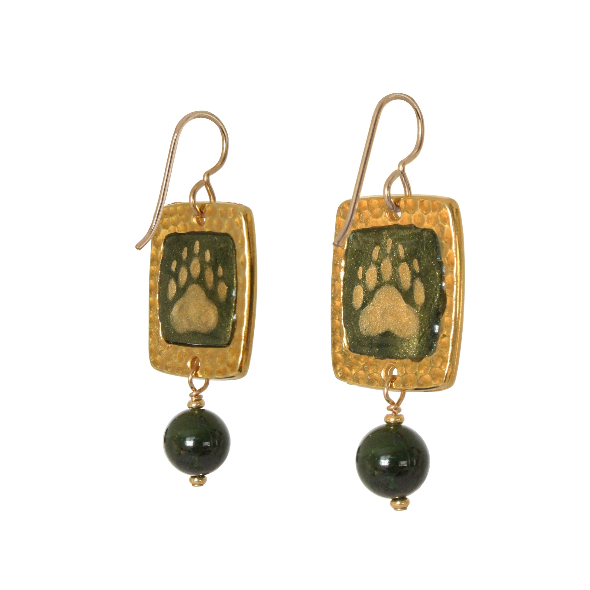 Night Forest Bear Paw Earrings features a bear paw pendant above a BC jade bead. The pendant has an artist's hand-painted rendition bears paw inside a gold pewter rectangle frame.
