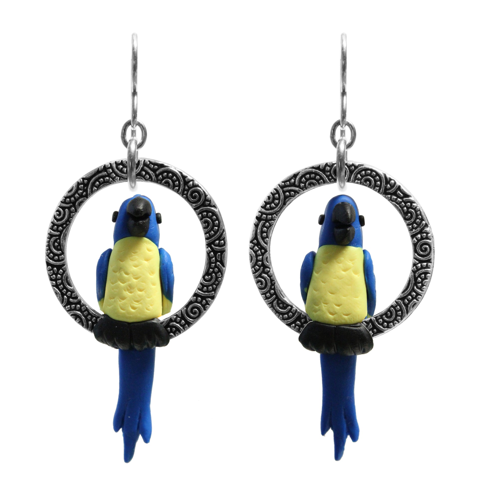 Start the day with a pair of cute, tropical parrots chattering away in your ear. Even though they don't actually talk, these hand-made macaws will still happily keep you company with their friendly expressions. Their perches are decorative TierraCast silver pewter rings adorned with swirling patterns reminiscent of jungle vines.