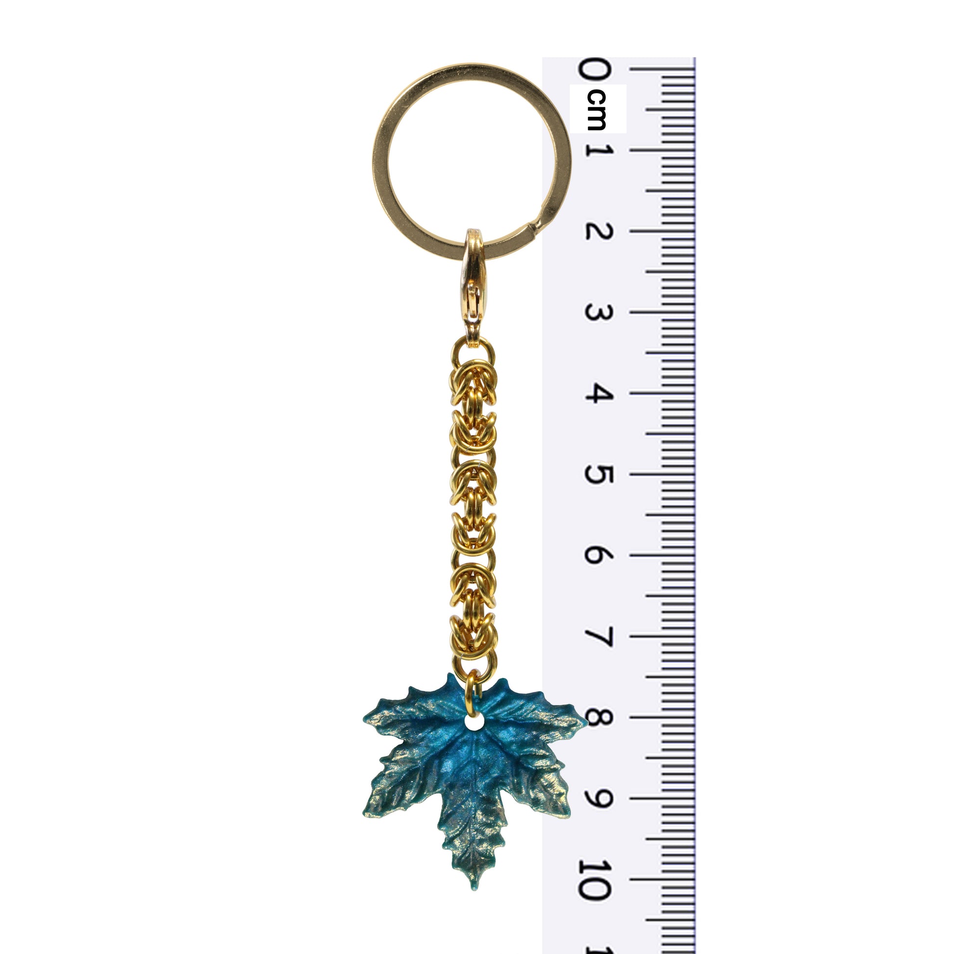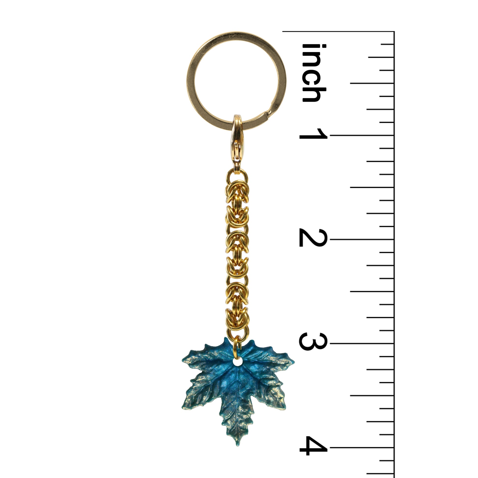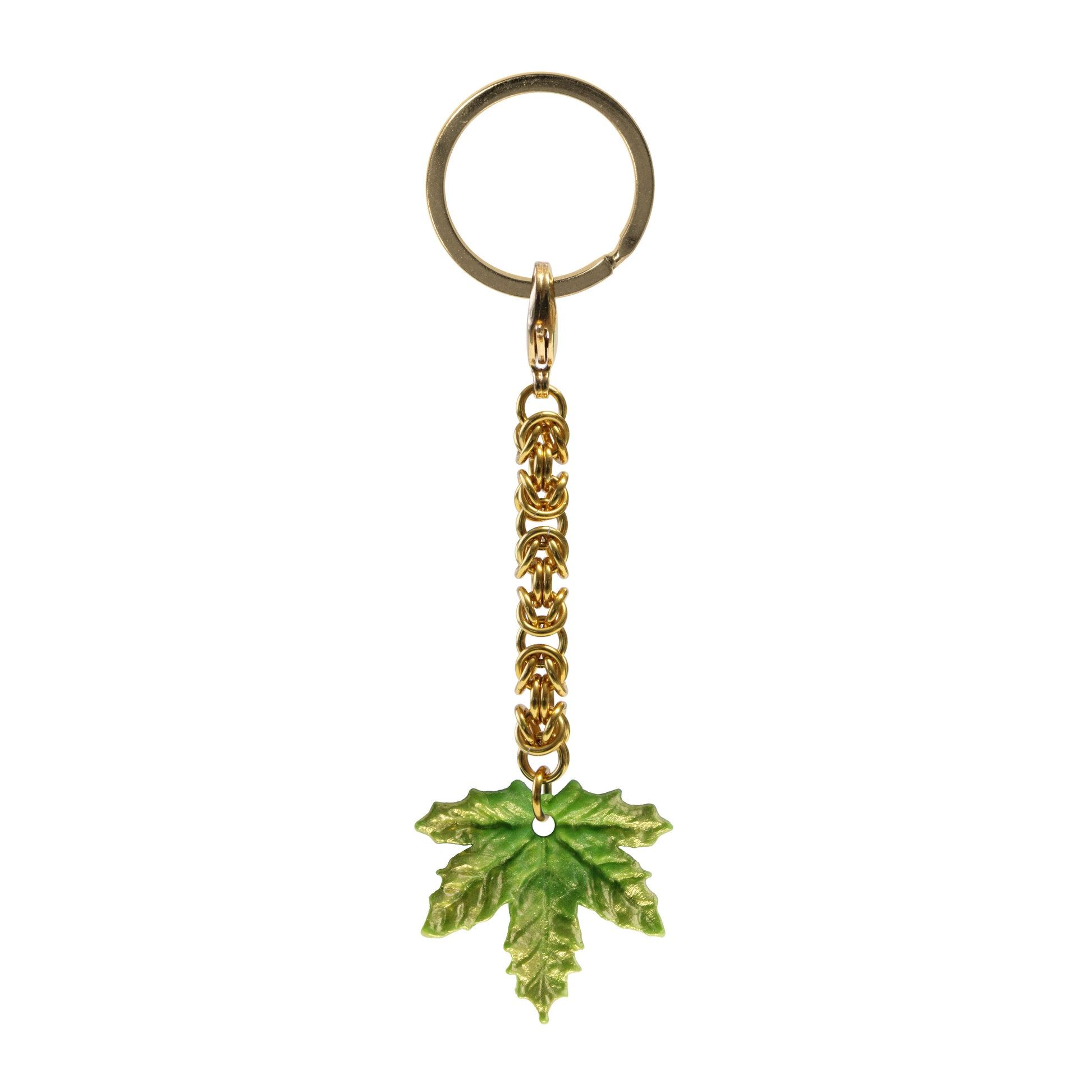 Maple Leaf Keychain has a split ring for adding keys, and a lobster clasp which allows you to detach it from the split ring and use as a purse charm. Attached to the lobster clasp is a golden handwoven chainmail chain ending in a leaf charm, in one of 4 colors of your choosing: Spring Green, Summer Green, Autumn Red, or Winter Blue.