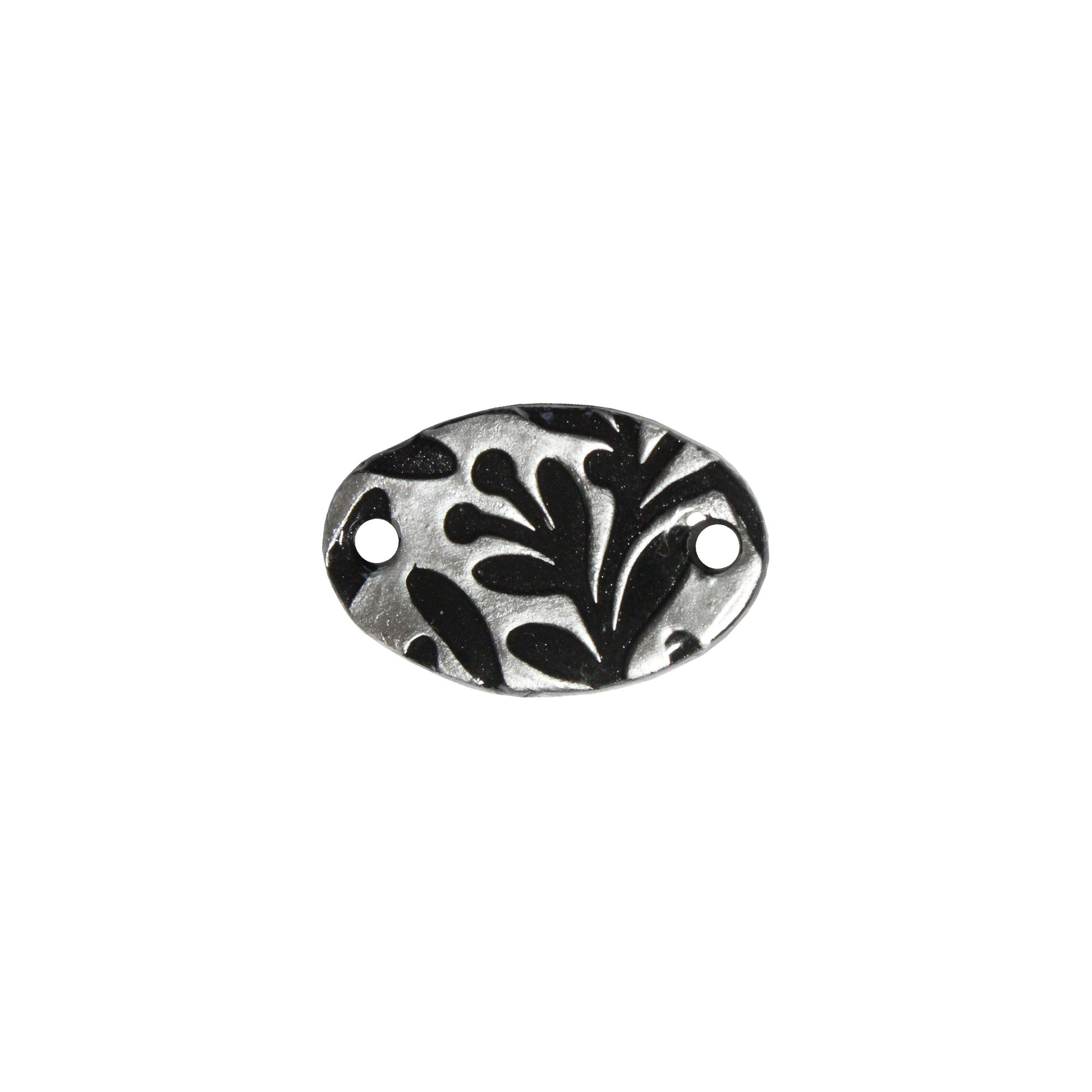 Flora Oval Link is a lightweight polymer clay link with black leafy flower patterns on a silver background. The link is oval shaped with a thread hole at each end for adding jump rings. This is a one sided link with the reverse black with a raised pattern.