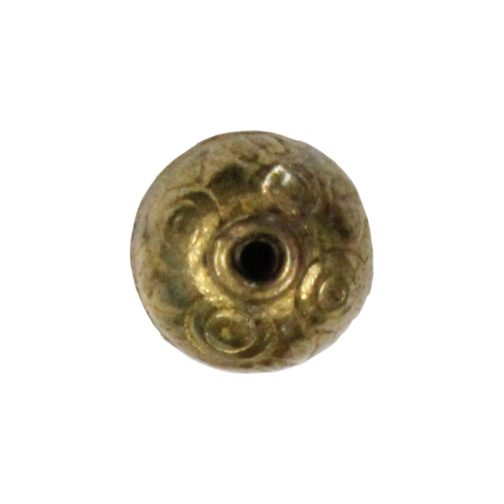 Patterned Globe Ball Bead is a base metal bead with an antiqued brass finish. Each bead is 10 long x 9.5mm in diameter with a 1.2mm thread hole. This bead is globe or ball shaped with swirls or arcs like patterning around the bead. These beads have a handmade look and feel and would be great on an organic style jewelry or craft project.