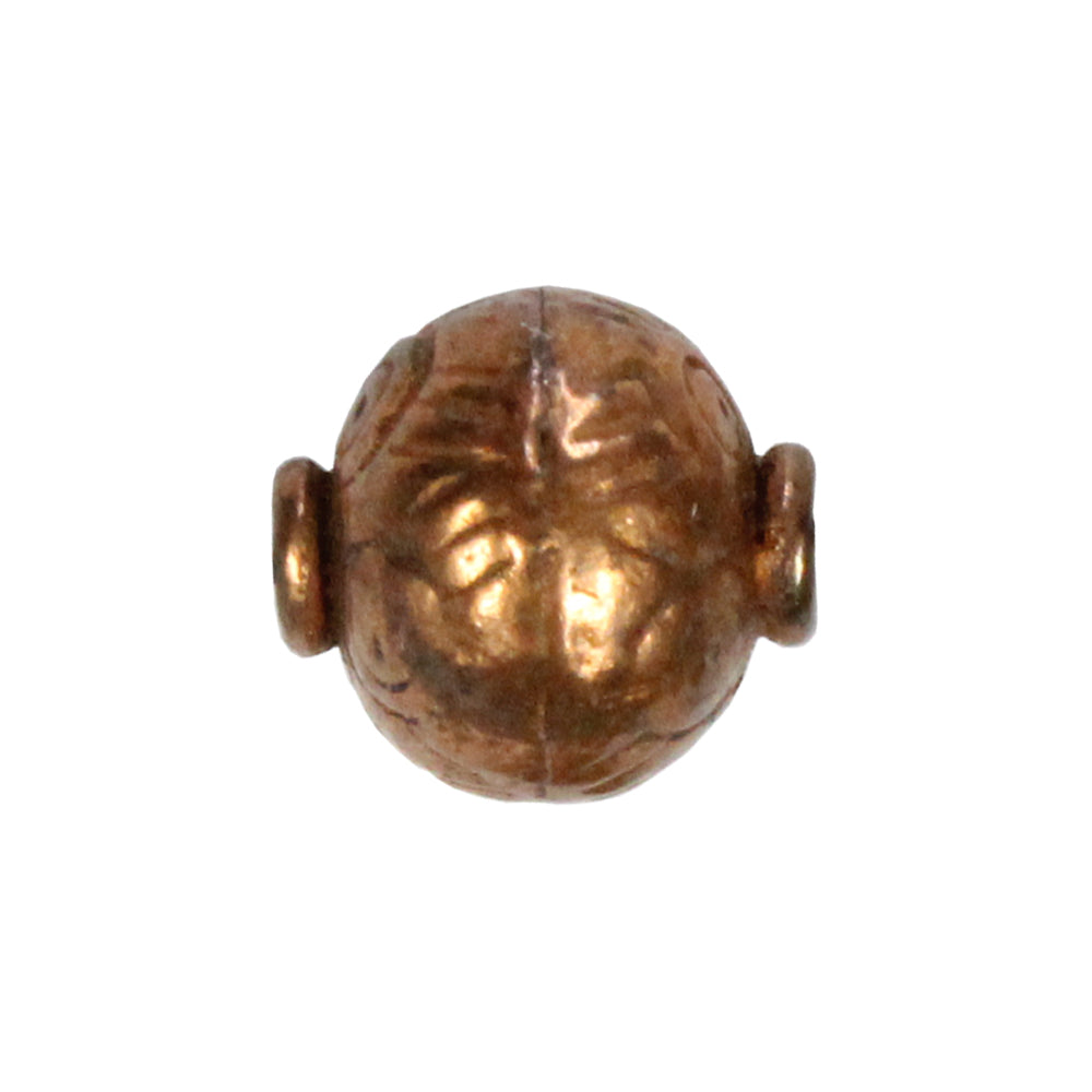Patterned Globe Ball Bead is a base metal bead with an antiqued copper finish. Each bead is 10 long x 9.5mm in diameter with a 1.2mm thread hole. This bead is globe or ball shaped with swirls or arcs like patterning around the bead. These beads have a handmade look and feel and would be great on an organic style jewelry or craft project.